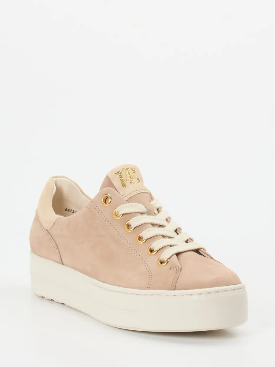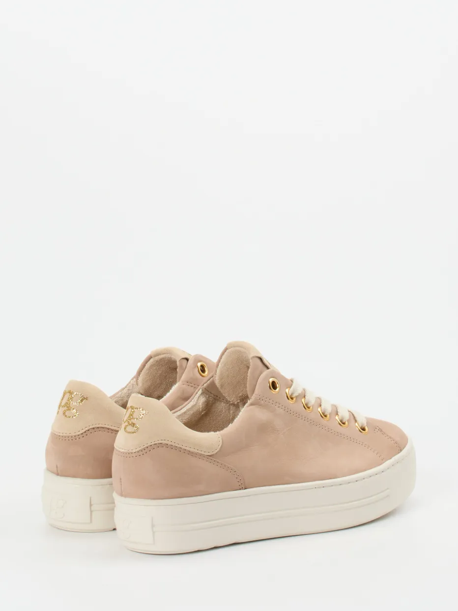 Subtiler Chic für urbane Sommertage.Paul Green interpretiert den Damen-Sneaker neu: sportiv, komfortabel und mit klarer Formsprache. Für entspannte City-Walks oder sommerliche Freizeitstyles sorgt das soft angeschliffene Nubukleder in sanftem Beige für angenehme Haptik und einen femininen Look. Goldfarbene Ösen und eine dezente Logo-Stickerei auf Zunge und Ferse setzen feine Akzente. Die lederbezogene SuperSoft-Innensohle sowie das atmungsaktive Frottee-Futter erhöhen den Tragekomfort spürbar. Die klassische, rund geformte Silhouette ruht auf einer weißen Plateausohle mit prägnantem Markenbranding. Stylingtipp: passt hervorragend zu weißen Leinenhosen und kleinen Crossbody-Bags. Hochwertige Materialien und klare Linien – charakteristisch für Paul Greens zeitlose Designästhetik.