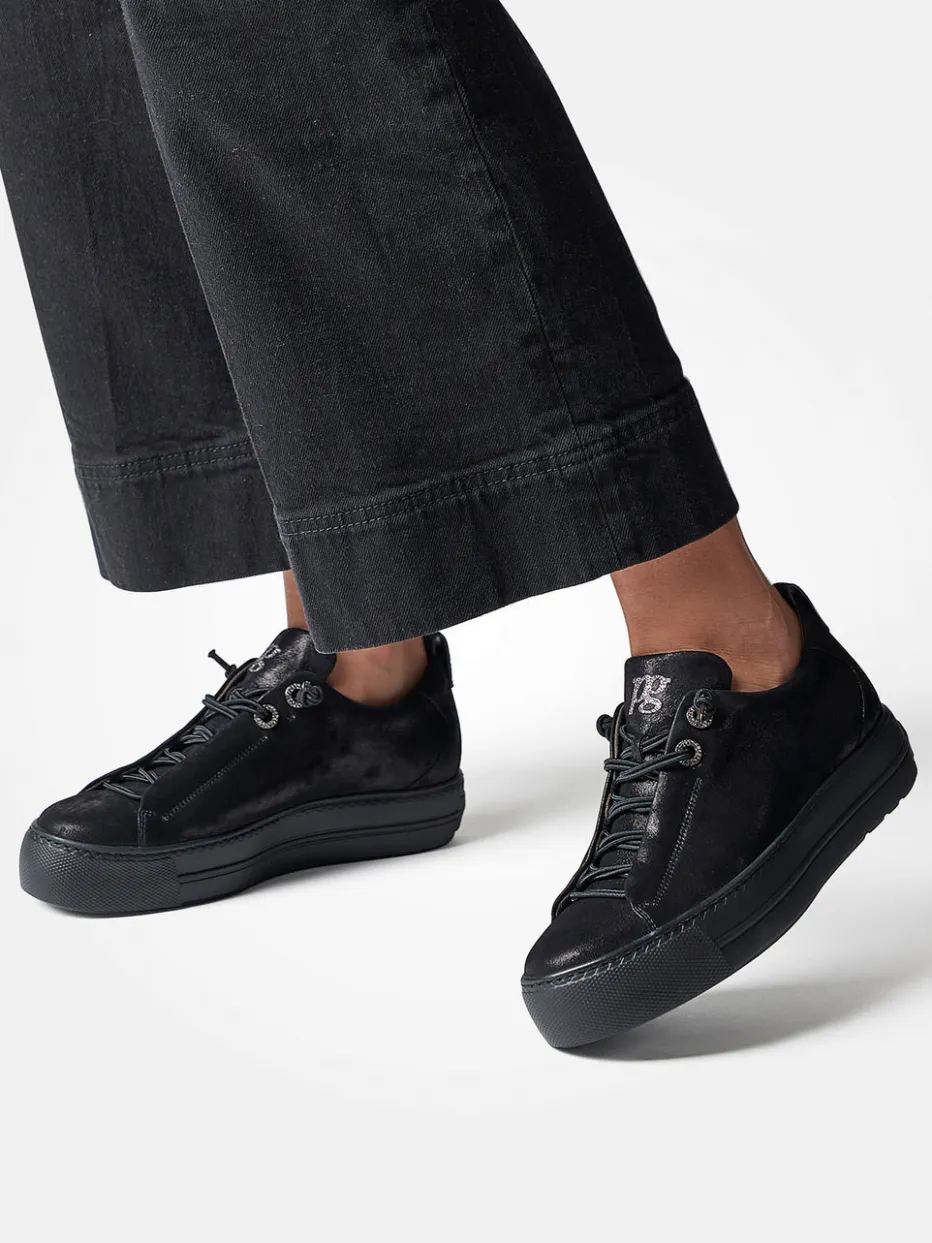 Modernes Understatement für jeden Tag.Paul Green präsentiert einen Damen-Plateau-Sneaker in monochromem Schwarz. Ideal für entspannte City-Tage verbindet das Modell samtig angeschliffenes Nubukleder mit einer flexiblen Schnürung samt Zier-Ösen. Das rund-kompakte Design sorgt mit gepolstertem Einstieg, Velourslederfutter und anatomisch geformtem Fußbett für angenehmen Tragekomfort. Eine solide Gummisohle mit leichtem Plateau unterstreicht den Streetstyle-Charakter und greift aktuelle Plattform-Trends auf. Dezente Logo-Stickereien und silberfarbene Details setzen subtile Akzente. Lässt sich ideal zu Oversized-Hoodies oder schwarzen Ledertaschen kombinieren. Bequemes Design trifft auf trendigen Minimalismus – ganz in Paul Green Manier.