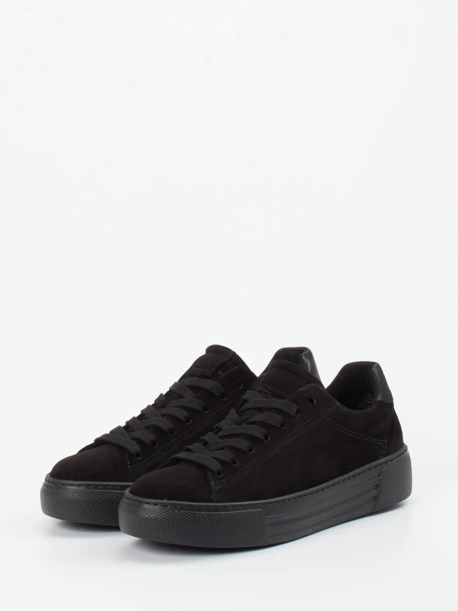 Stilvoll durch den Alltag.Gabor Comfort präsentiert mit diesem Damen-Plateau-Sneaker einen stilbewussten Freizeitschuh aus edlem, samtig angeschliffenem Veloursleder. Schwarz ist Trumpf – das monochrome Design mit tonaler Schnürung, matter Oberfläche und glänzender Fersenkappe schafft ein urbanes Gesamtbild. Die strukturierte Gummisohle verleiht mit ihrer abriebfesten Ausführung Trittsicherheit, während das herausnehmbare, gepolsterte Fußbett langanhaltenden Tragekomfort ermöglicht. Minimalistische Formgebung trifft auf Trends wie „Platform Soles“ und „Monochrome Looks“. Besonders gut kombinierbar zu lässigen Jeans oder monochromen Outfits. Die typische Gabor-Qualität vereint Komfortweite mit smarter Alltagstauglichkeit.