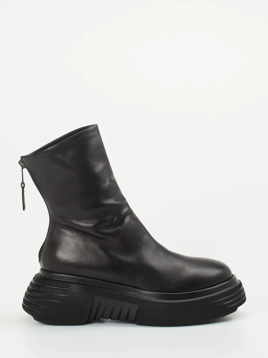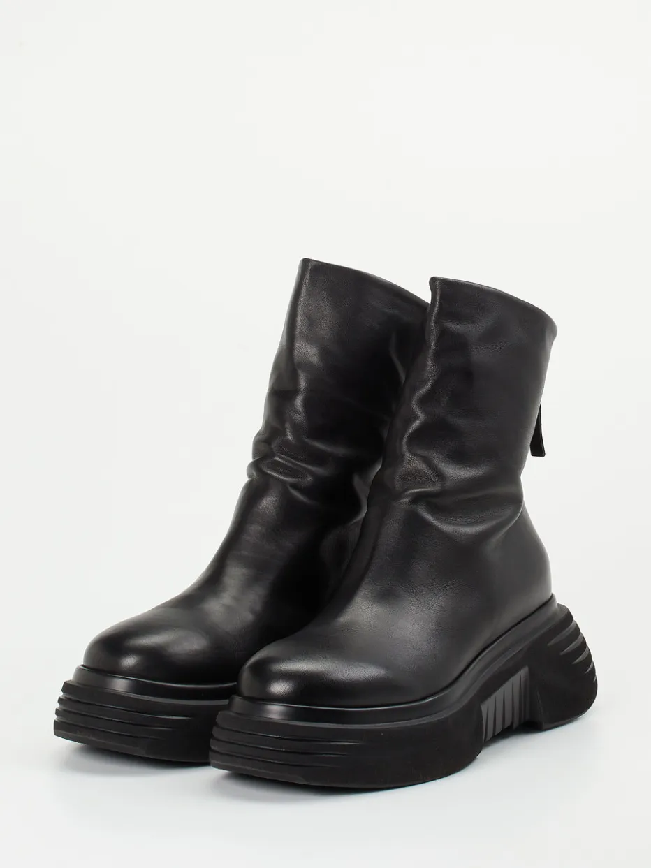 Ob beim Ausgehen oder im Alltag – die extra leichte Plateausohle mit horizontaler Struktur bietet kräftigen Grip und ist dabei überraschend bequem. Schwarzes Kalbleder und matte Oberfläche sorgen für eine kompromisslose Eleganz, akzentuiert durch einen rückseitigen Reißverschluss mit Zuglasche. Die voluminöse Silhouette greift den Chunky-Trend der Saison auf und fügt sich souverän in Streetwear-Looks ein. Harmoniert besonders gut mit Oversized-Mänteln und monochromen Accessoires.