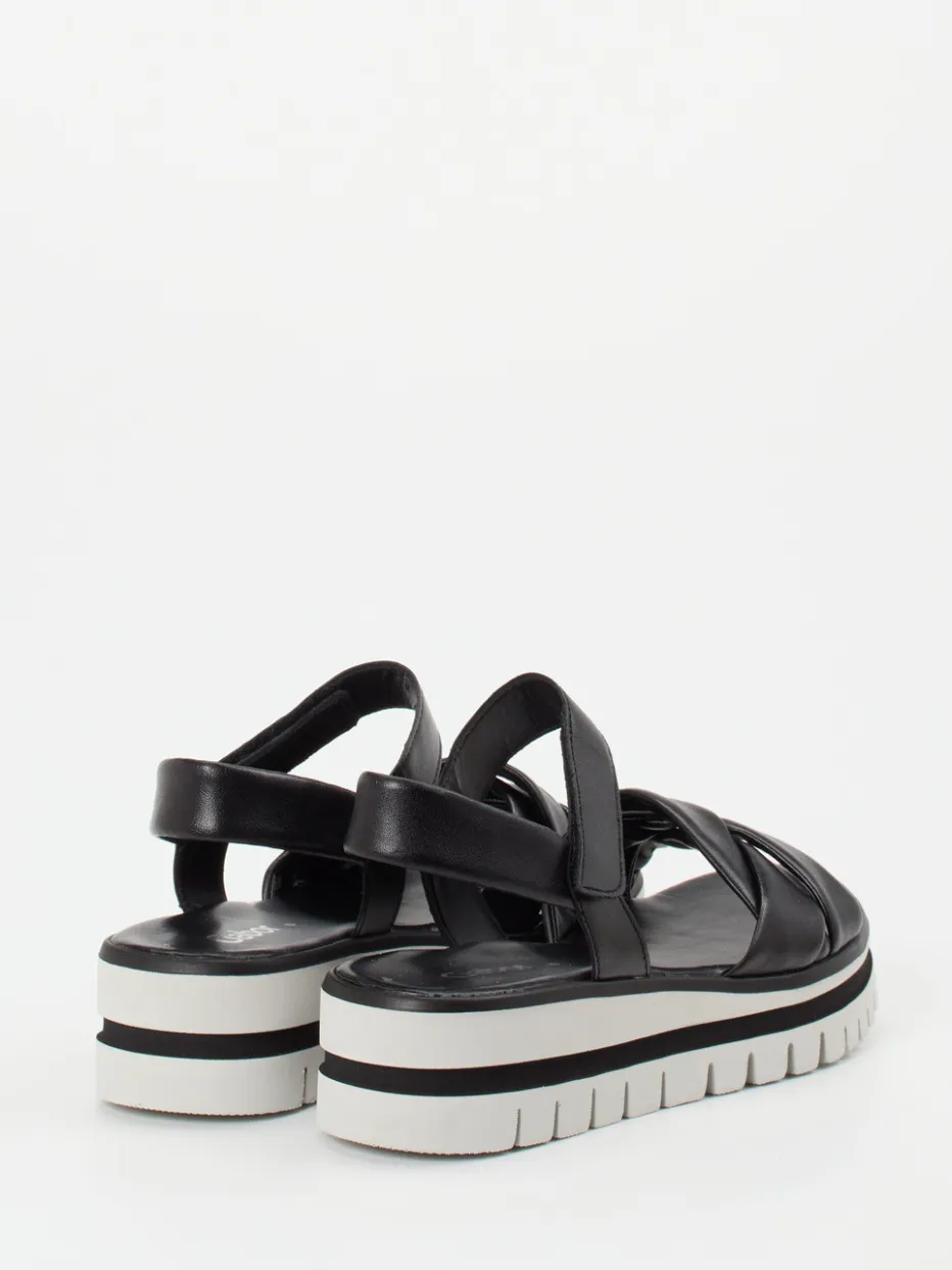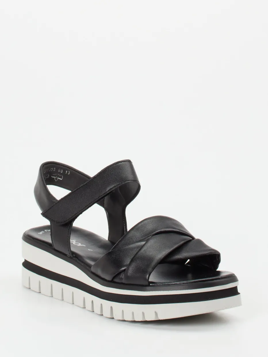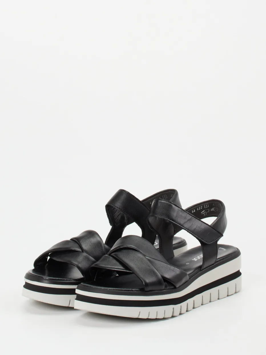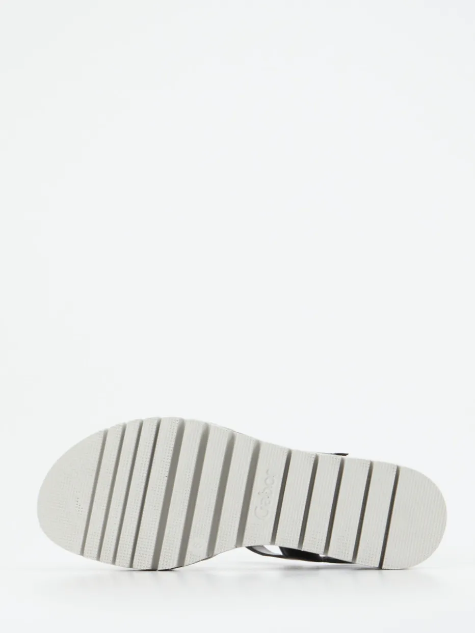 Sommerkomfort in klarer Formsprache.Gabor präsentiert mit dieser Damen-Plateausandale ein Modell, das Komfort und Design gekonnt vereint. Ideal für ausgedehnte Stadtspaziergänge oder entspannte Urlaubstage: Die Riemen aus schwarzem Lammleder liegen geschmeidig am Fuß und harmonieren mit der offenen, überkreuzten Silhouette. Ein Klettverschluss am Knöchel unterstützt die flexible Passform. Die matt strukturierte Oberfläche und die kontrastreich gestaltete Zweifarbensohle mit tiefem Profil verleihen dem Modell eine moderne Note. Weiche Polsterungen und Streetwear-inspirierte Details runden das Gesamtbild ab. Besonders wirkungsvoll zu monochromen Sommerlooks oder fließenden Midi-Röcken. Gabor steht hier für maximalen Tragekomfort im cleanen, alltagstauglichen Design.