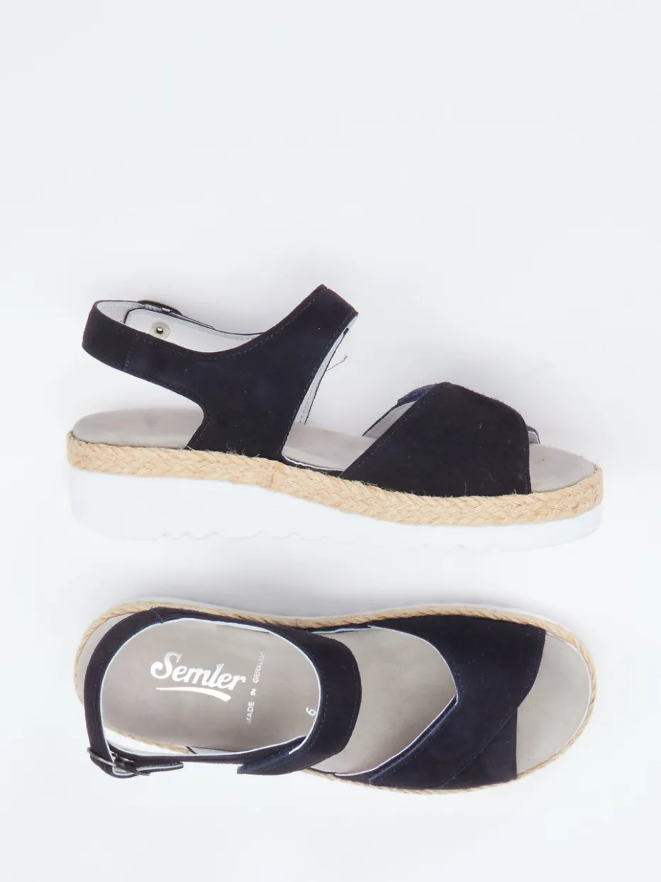 Stilvoll in den Sommer.Die Marke Semler präsentiert hier eine komfortorientierte Damen-Sandalette mit Plateausohle. Ob im Stadtbummel oder am Urlaubsort: Das Modell aus blauem Veloursleder mit samtig-matter Oberfläche überzeugt durch seinen relax-ten Look und bequemes Tragegefühl. Das gepolsterte, herausnehmbare Fußbett unterstützt auch eigene Einlagen, während Klettverschlüsse und verstellbarer Fersenriemen für passgenauen Halt sorgen. Weiße Gummisohle mit rutschfester Profilierung und sommerlicher Jute-Umrandung setzen dezente Akzente. Ein stimmiger Mix aus minimalistischer Designsprache und trendiger Natürlichkeit. Lässt sich ideal mit Leinenkleidern oder Basttaschen kombinieren. Perfekt für entspannte Sommermomente mit komfortvollem Anspruch.