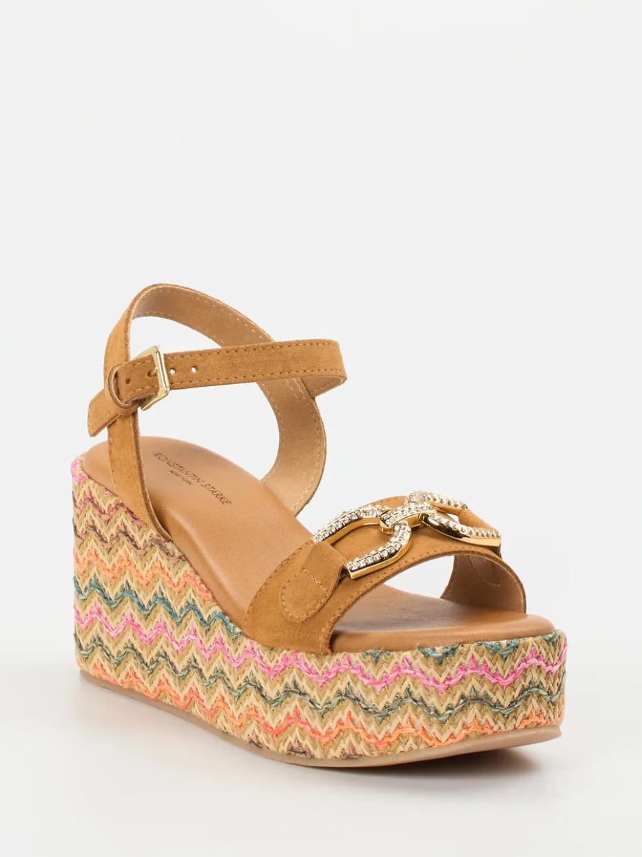 Boho-Glamour trifft farbenfrohe Handwerkskunst.Konstantin Starke präsentiert mit dieser Plateausandale ein stilvolles Damenmodell für die warme Jahreszeit. Perfekt für Urlaubsmomente oder entspannte Citytage: Der cognacbraune Velourslederriemen mit matt anmutender Oberfläche harmoniert reizvoll mit einer mehrfarbig geflochtenen Jute-Plateausohle im Zickzackdesign. Funkelnde Akzente setzt die goldfarbene Dornschließe mit Strassbesatz am Knöchelriemen. Die keilförmige Silhouette bietet durch 8 cm Absatzhöhe und gepolsterte Ledersohle angenehmen Tragekomfort. Stilistisch orientiert sich das Modell an der Retro- und Boho-Ästhetik, passend zur SS24-Platform-Trendwelle. Ein Blickfang, der Komfort und Trendgespür gekonnt verbindet.