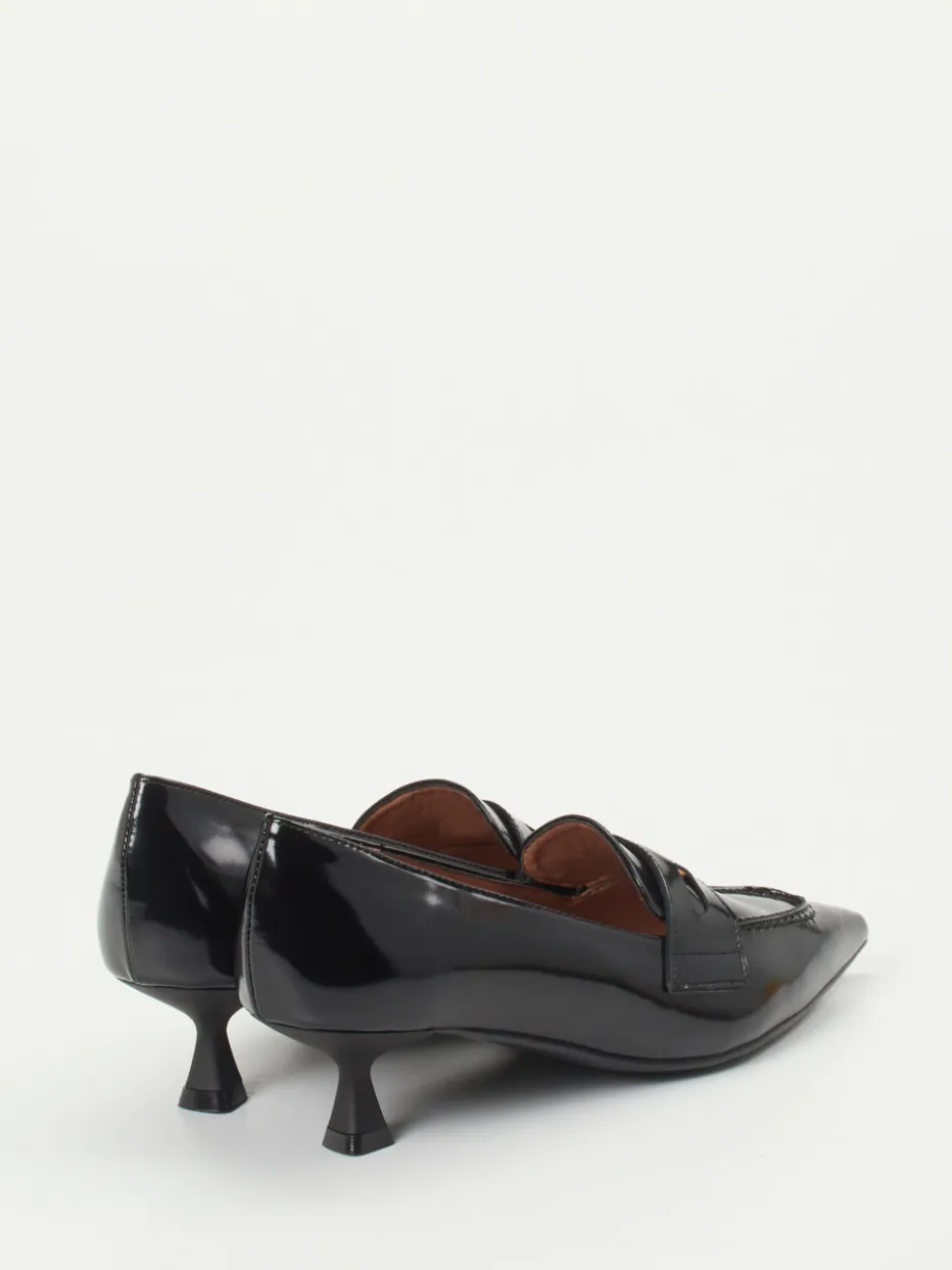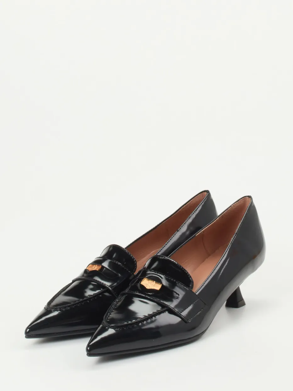 Stilvolle Silhouette trifft auf Glanz.Konstantin Starke präsentiert elegante Damen-Pumps mit Kitten Heel und Loafer-Anmutung. Für elegante Bürolooks oder Events mit Anspruch: Dieses Modell überzeugt durch hochwertiges schwarzes Hochglanzleder, samt spitz zulaufender Form und einer goldfarbenen Münzspange auf dem Spann. Der klassische Schlupfschuh verbindet Vintage-inspirierte Loafer-Details mit einer modernen, minimalistisch gehaltenen Linienführung. Die gepolsterte Kalbleder-Innensohle sorgt für angenehmen Tragekomfort, während der 4,5 cm hohe Kitten Heel dem Look eine feminine Note verleiht. Im Trendbereich zwischen „Quiet Luxury“ und „Retro Loafer Revival“ positioniert, lässt sich dieser Schuh hervorragend zu Blazern oder schlichten Etuikleidern kombinieren. Ein souveränes Statement-Piece mit ikonischer Formvollendung.