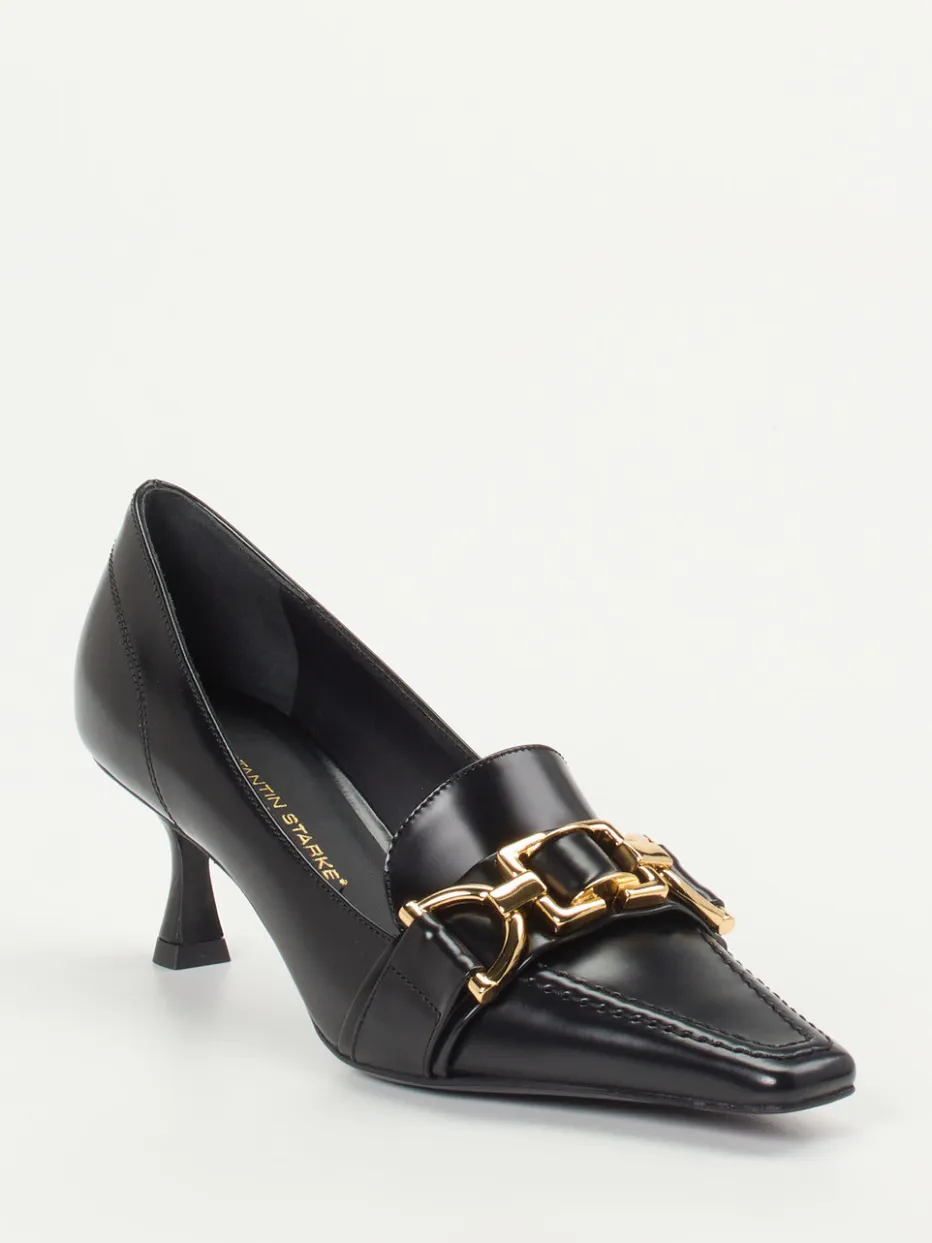 Statement in Schwarz und Gold.Konstantin Starke präsentiert klassische Pumps in spitz zulaufender Loafer-Silhouette. Für Tage mit Präsenzanspruch verbinden diese Kitten-Heel-Pumps Hochglanzleder in tiefem Schwarz mit einer goldfarbenen Gliederkette als markanter Zierspange. Ihr femininer Leisten, das offene Dekolleté und der komfortable 5-cm-Absatz vereinen stilvolle Aussage mit Tragekomfort. Das Innenfutter aus Ziegenleder sorgt für ein angenehmes Fußklima, während die rutschhemmende Gummieinlage in der Ledersohle zuverlässigen Halt gibt. Inspiriert vom Vintage-Stil der 90er und aktuellen Metallic-Trends, sind sie ideal zu Blazern oder eleganten Ensembles. Ein Modell für souveräne Looks mit kultivierter Zurückhaltung.