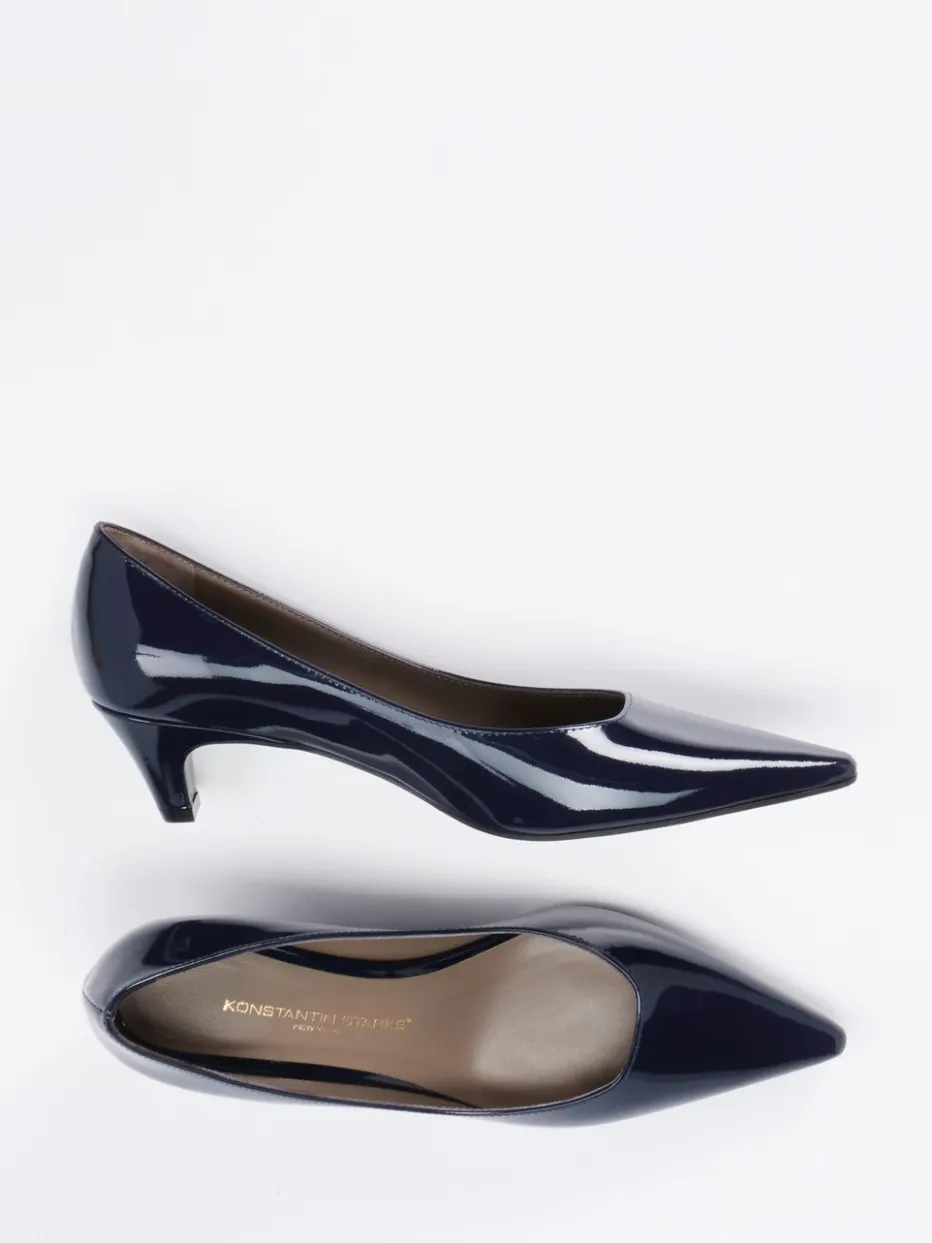Stilsicher durch Büro und Event.Konstantin Starke präsentiert einen klassischen Damen-Pumps mit moderner Raffinesse. Perfekt für Tage mit Terminfülle und abendlichen Empfängen: Das glänzende Lackleder in edlem Dunkelblau unterstreicht die hochwertige Verarbeitung. Die spitz zulaufende Form in Kombination mit einem filigranen Kitten Heel und Schlupfform sorgt für femininen Minimalismus. Ton-in-Ton-Nähte, glattes Kalblederfutter und eine dezente Synthetiksohle runden das Gesamtpaket ab. Der „New Formalwear“-Trend wird hier in seiner elegantesten Ausprägung interpretiert. Kombiniert mit navyfarbenem Hosenanzug oder Seidenkleid besonders wirkungsvoll. Ein Schuh mit souveränem Stilstatement – dezent, komfortabel, markenbewusst.