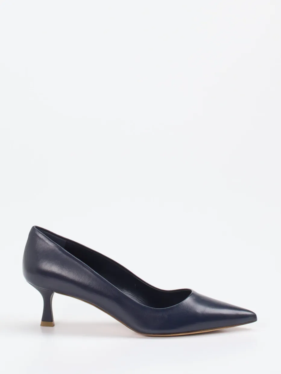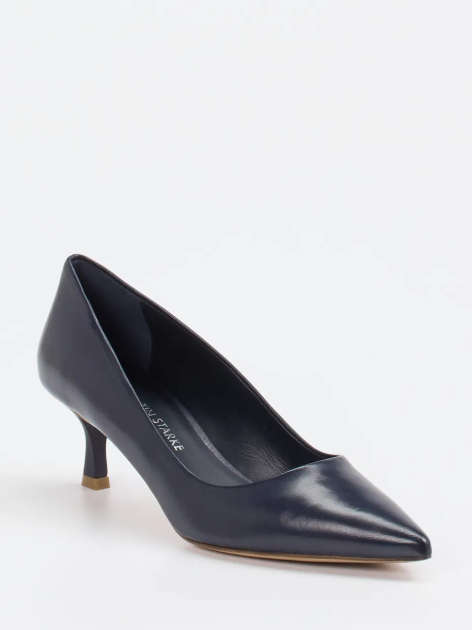 Schimmernder Klassiker mit femininer Linie.Konstantin Starke interpretiert klassische Damenpumps neu. Dieser dunkelblaue Kitten-Heel aus edlem Lackleder überzeugt durch seine glänzende Oberfläche und die pointiert schlanke Form. Die spitze Vorderpartie, kombiniert mit einer dezenten Schlupfform, unterstreicht die feminine Silhouette. Eine hochwertige Ledersohle mit dezent integrierter Gummiintarsie sorgt für sicheres Auftreten – ideal für Business-Termine oder festliche Anlässe. Die schlichte Ton-in-Ton Gestaltung folgt dem „Quiet Luxury“-Trend und ergänzt klassische wie minimalistische Garderoben. Kombiniert mit einem Navy-Blazer wirkt das Modell besonders stilsicher. Ausdruck reduzierter Eleganz mit handwerklichem Anspruch.