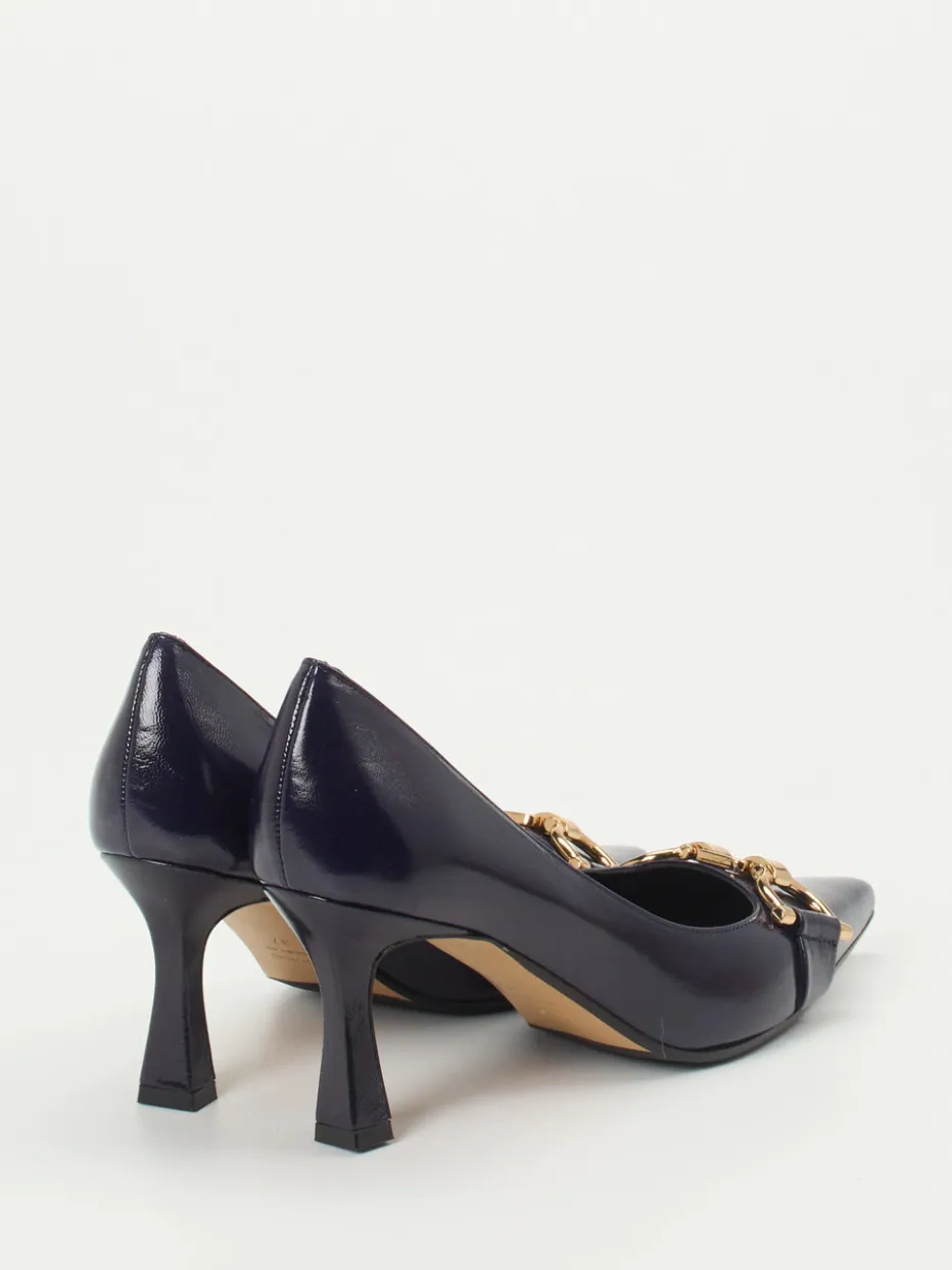 Dieser spitz zulaufende Kitten Heel vereint glänzendes Lackleder mit goldfarbenem Akzent und bringt diskrete Raffinesse in jeden formellen Look.