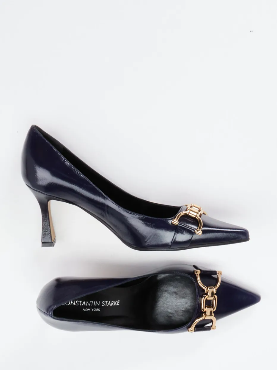 Stilsicherer Auftritt mit Glanz.Konstantin Starke interpretiert klassische Damen-Pumps in edlem Lackleder neu. Für elegante Business-Meetings oder festliche Anlässe bietet die spitz geformte Silhouette in tiefem Dunkelblau mit glanzvoller Oberfläche stilvolle Präsenz. Eine goldfarbene Trensengarnitur auf dem Vorderblatt akzentuiert das minimalistische Design. Der circa 7 cm hohe Kitten Heel sorgt für femininen Schwung, während die halbledere Sohle mit Gummieinsatz optimalen Tragekomfort garantiert. Der Vintage-inspirierte Look greift den Trend „Quiet Luxury“ klar auf. Ideal zu schmal geschnittenen Stoffhosen oder einer Seidenbluse. Ein stilvoller Begleiter mit handwerklicher Raffinesse.