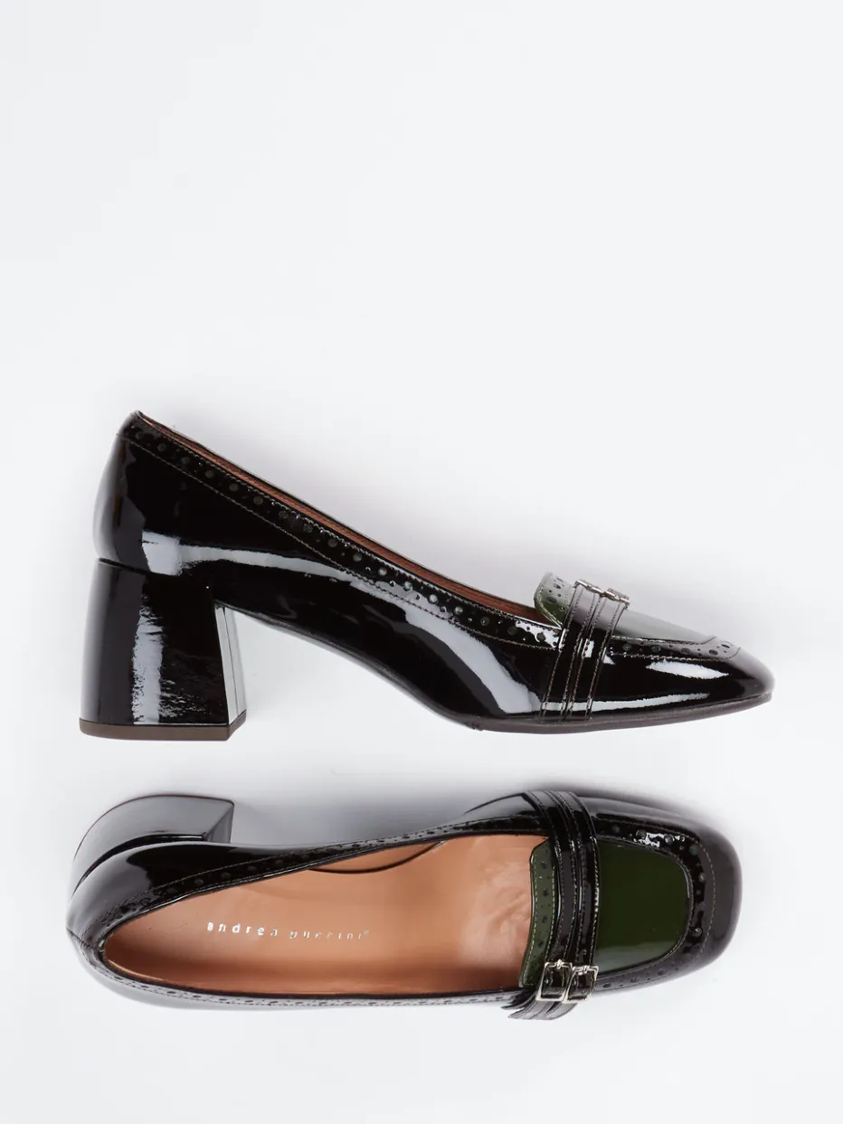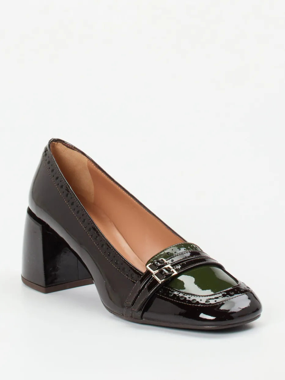 Ideal für stilvolle Office-Looks oder einen gehobenen Freizeitauftritt bieten diese Pumps in glänzendem Lackleder komfortablen Halt. Der dominant schwarze Schaft mit kontrastierend olivgrüner Vorderpartie wird mittels Brogue-Details und filigraner Zierschnallen veredelt. Die klassische Silhouette mit Blockabsatz verbindet Vintage-60s-Flair mit moderner Eleganz. Eine gepolsterte Innenausstattung aus Kalbleder sorgt für angenehmen Tragekomfort über Stunden. Der Retro Loafer Look fügt sich perfekt in aktuelle „Quiet Luxury“-Tendenzen ein – kombinierbar etwa mit Seidenbluse oder Hosenanzug.