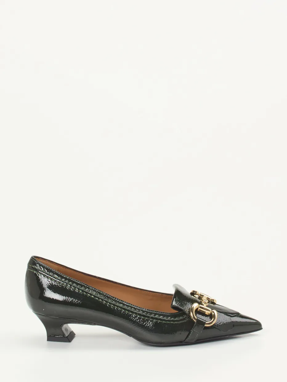 Dieser Kitten Heel kombiniert glänzendes Lackleder in tiefem Grün mit ikonischer Horsebit-Hardware – ein stilvolles Essential für elegante Business- oder Festtags-Looks.