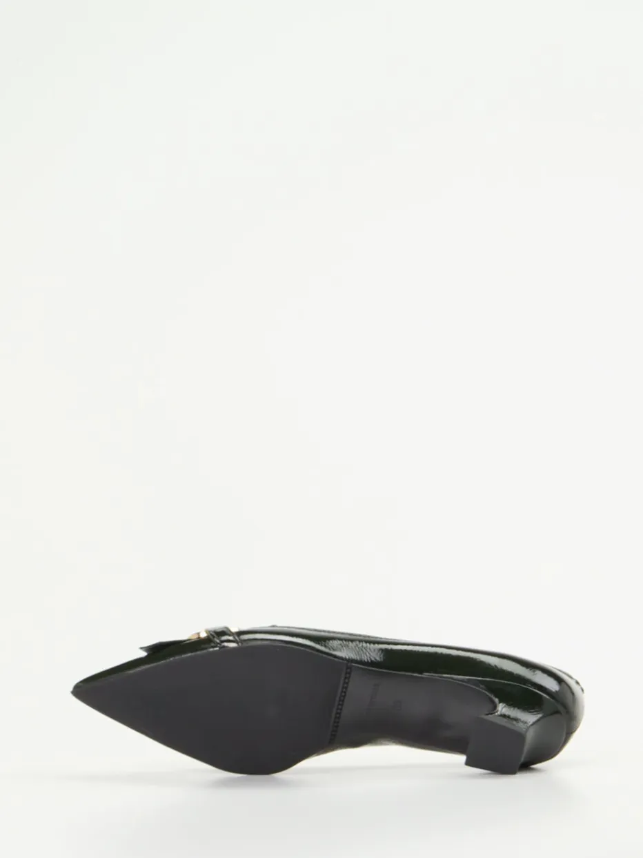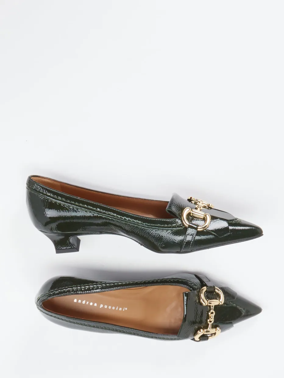 Stilsicherheit im Herbsttrend.Andrea Puccini unterstreicht mit diesen Pumps die Verbindung von Klassik und Modernität. Ideal für gepflegte Business-Termine oder elegante Dinnersituationen überzeugt das Modell durch hochwertiges, glänzendes Lackleder mit samtiger Haptik. Der dunkle Tannengrünton wirkt edel und harmoniert mit der goldfarbenen Horsebit-Zierkette auf dem Spann. Spitz zulaufende Silhouette, Schlupfform und der flache Kitten Heel mit ca. 3,5 cm verleihen femininen Chic und angenehmen Komfort. Als Trendpiece der Saison greift es den „Quiet Luxury“-Stil auf. Ein souveräner Allrounder mit italienischer Noblesse.