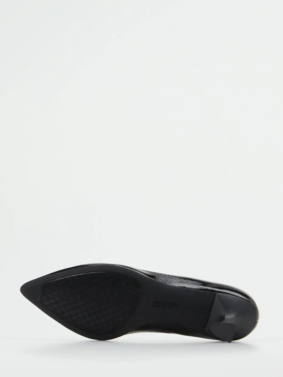 Ideal für besondere Anlässe oder stilvolle Abend-Events: Das spiegelnd glänzende, schwarze Lackleder und die spitz zulaufende Silhouette verkörpern puristische Eleganz. Der skulpturale, kantige Absatz setzt ein modernes Design-Statement und verleiht dem Modell eine besondere architektonische Note. Eine weich gepolsterte Innensohle aus Ziegenleder sorgt für ein angenehmes Laufgefühl, während die rutschfeste Gummisohle sicheren Stand garantiert. Im Trendfeld „Quiet Luxury“ positioniert, passt der Schuh ideal zum minimalistischen Tailoring oder zur schlichten Cocktailrobe.