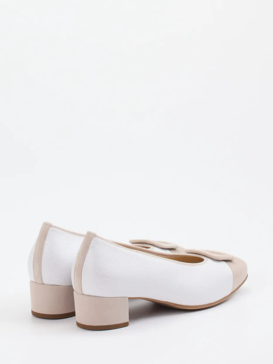 Eleganz neu interpretiert.Die Marke Hassia präsentiert hier einen femininen Blockabsatz-Pumps für Damen. Ideal für den modernen Büroalltag oder stilvolle Freizeitkombinationen bietet das Modell eine angenehme Weite J und eine klassische Silhouette. Weißes Kalbleder mit feinem Silberpünktchenmuster trifft auf eine beigefarbene Velourslederkappe mit dekorativer Schnalle. Die leicht genarbte Oberfläche fügt sich in das dezente Quiet-Luxury-Konzept ein. Der 3 cm hohe Blockabsatz und eine gepolsterte Innensohle sorgen für Komfort – auch für Einlagen geeignet. Kombiniert mit hellen Stoffhosen entsteht ein klassisch-minimalistischer Look. Hassia steht für formvollendeten Komfort mit zeitloser Detailverliebtheit.