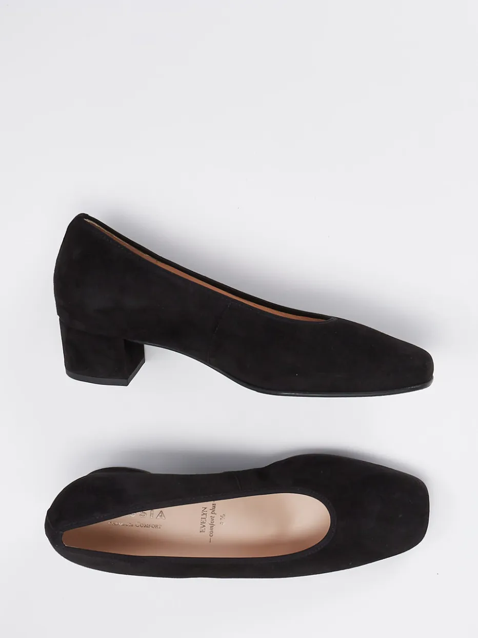 Fein gearbeitetes Veloursleder trifft auf alltagstauglichen Komfort. Die klassische Form und der bezogene Blockabsatz vereinen Eleganz mit Funktion.