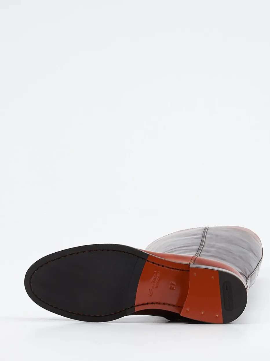 Edles Kalbleder mit sanftem Glanz und harmonischem Farbverlauf verleiht diesem kniehohen Reitstiefel von Santoni stilvolle Eleganz. Ein zeitloses Modell mit minimalistischem Anspruch und höchsten Komforteigenschaften.