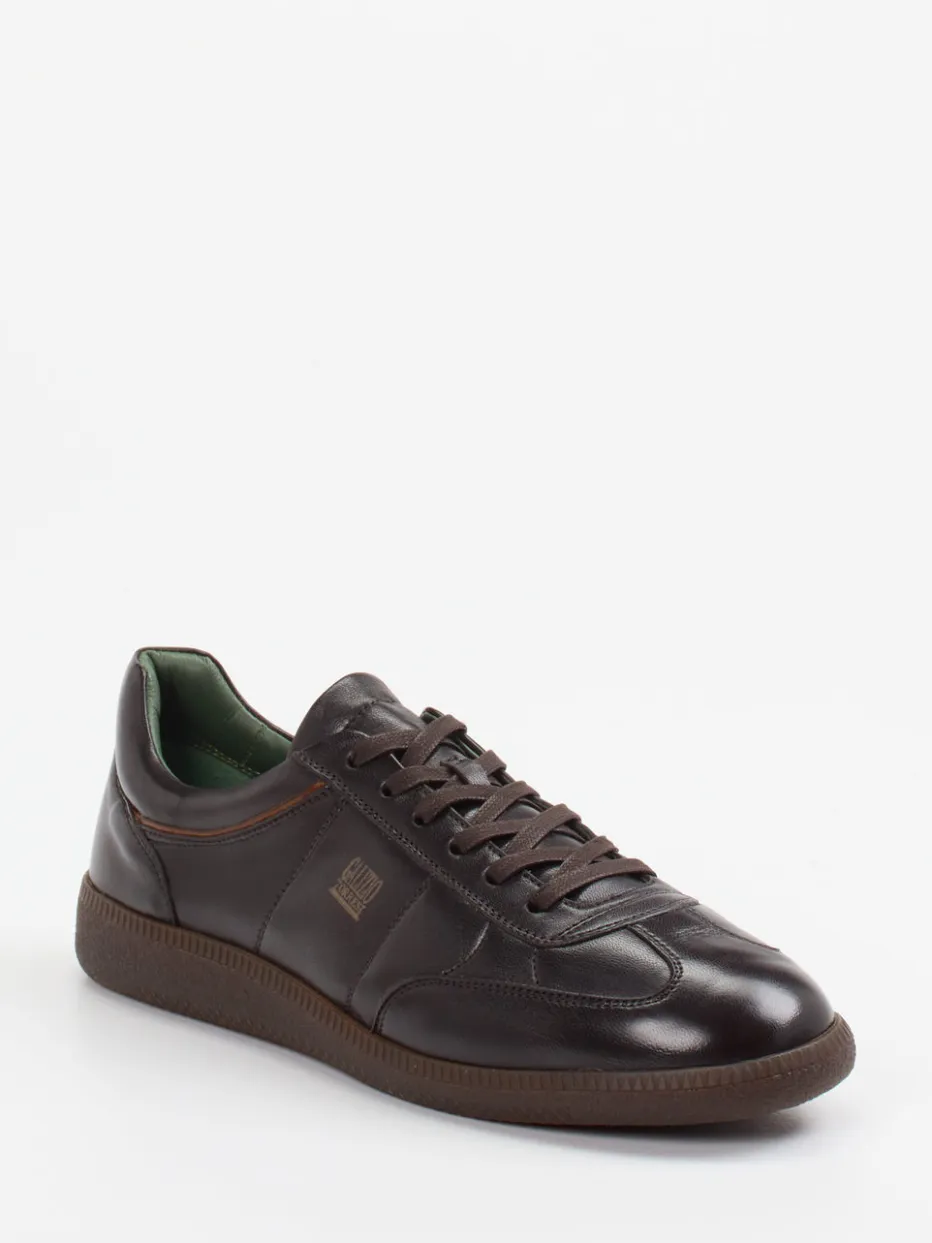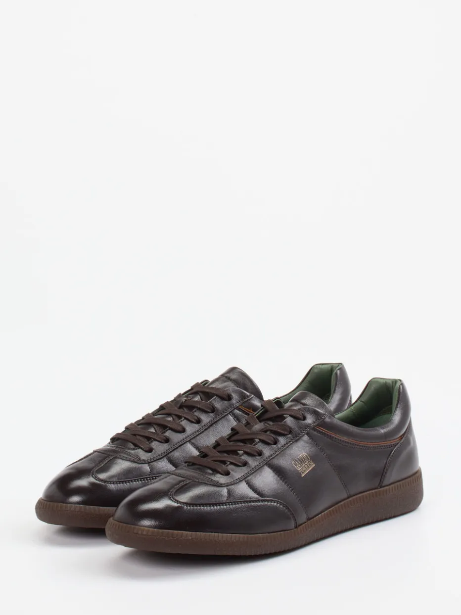 Dieser dunkelbraune Sneaker überzeugt durch butterweiches Kalbleder, eine klare Vintage-Silhouette und exzellente Handwerkskunst – perfekt für dezente Business-Casual-Looks mit modischem Anspruch.