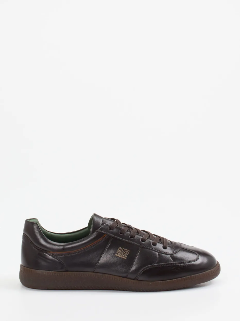 Stilvoller Retro-Look für anspruchsvolle Tage.Galizio Torresi präsentiert mit diesem Retro-Sneaker ein Herrenmodell, das klassischen Stil mit modernem Komfort verbindet. Ideal für Büro und Freizeit: Das Modell besticht durch feines, glänzendes Kalbleder in Schokoladenbraun mit minimalistischer Silhouette und goldfarbenem Logodetail. Innen sorgt ein tannengrünes Lederfutter mit gepolstertem Einstieg für angenehmen Tragekomfort, während die rutschfeste Gummisohle zuverlässige Stabilität bietet. Die Schnürung verleiht dem Look Struktur, das Gesamtdesign folgt der „Quiet Luxury“-Ästhetik – clean, hochwertig und unaufdringlich elegant. Lässt sich hervorragend zu Wollhosen oder einem Kaschmirpullover stylen. Eine perfekte Wahl für geradlinige Looks mit italienischem Anspruch.