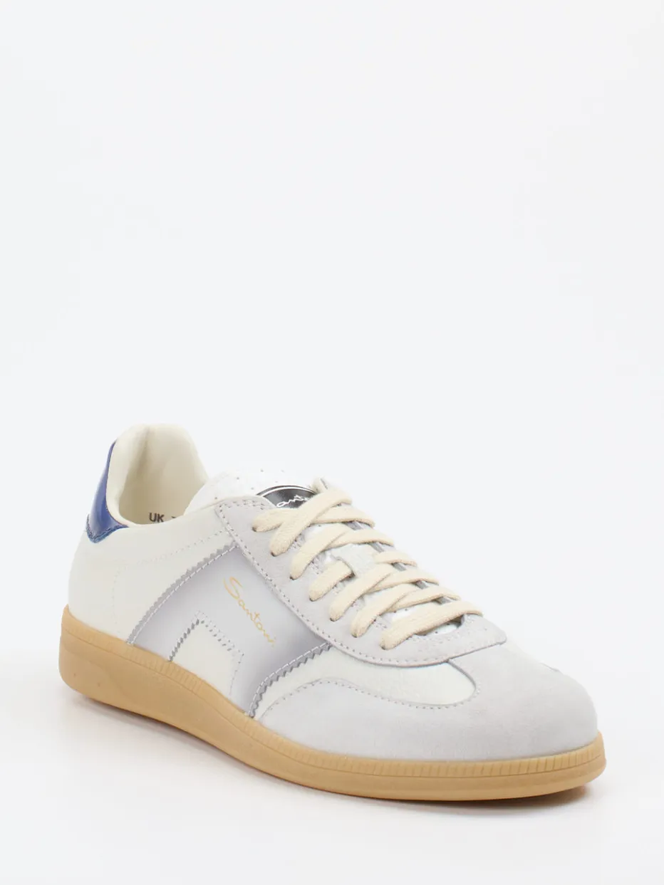 Minimalismus mit Retro-Charisma.Der Retro-Sneaker von Santoni verbindet lässigen Alltag mit hochwertigem Design. Ideal für entspannte Stadtbummel vereint der Sneaker weißes Kalbleder mit ausdrucksvoller Narbung und hellgraues Veloursleder in samtiger Haptik. Die flache, schmale Silhouette wird durch eine honigfarbene Gummisohle und glänzende Details an Ferse und Logo stilvoll ergänzt. Die Farbwelt aus Offwhite, Hellgrau und Kornblumenblau unterstreicht den minimalistischen Vintage-Stil. Der Schuh passt perfekt zu hellen Chinos und steht für das Trendthema „Quiet Luxury SS24“. Ein markentypisches Statement für kultivierten Freizeitstil und kompromisslosen Komfort.