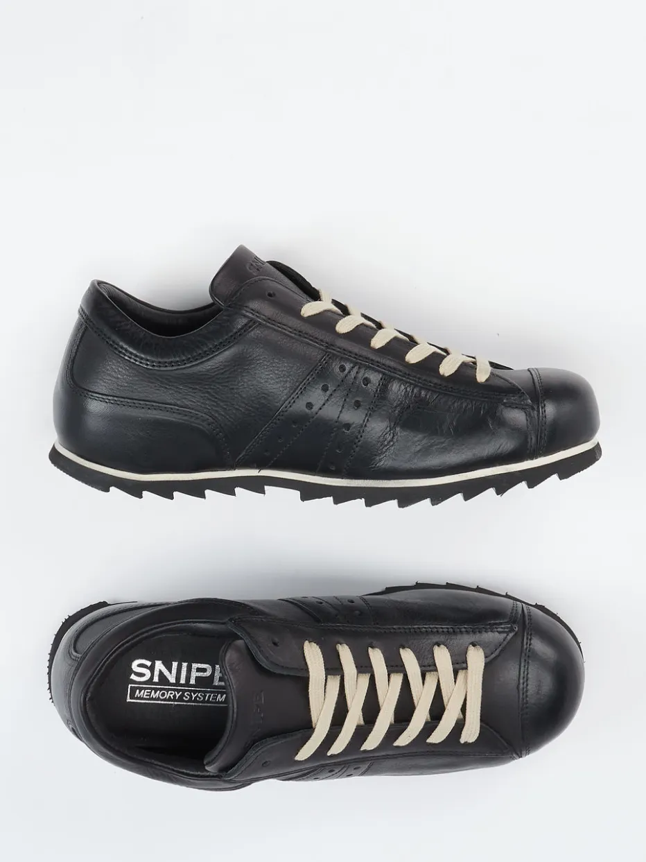 Vintage-Charme für jeden Tag.Snipe präsentiert einen Retro-Sneaker für Herren, der Stilbewusstsein mit Komfort verbindet. Durch das tiefschwarze Kalbleder mit genarbter Oberfläche und kontrastierende Schnürsenkel entsteht ein subtiler Hingucker im minimalistischen Streetwear-Stil. Die klassische, flache Silhouette wird durch eine markante Gummisohle mit Rillenprofil ergänzt, die rutschhemmenden Halt garantiert. Innen überzeugt der Sneaker mit weich gepolstertem Lederfutter und einem bequemen, herausnehmbaren Memory-Fußbett. Ideal für urbane Looks mit Vintage-Note und perfekt kombinierbar zu Jeans oder Lederjacke. Modern interpretierter Retro-Stil mit Snipe-typischer Komfortqualität.