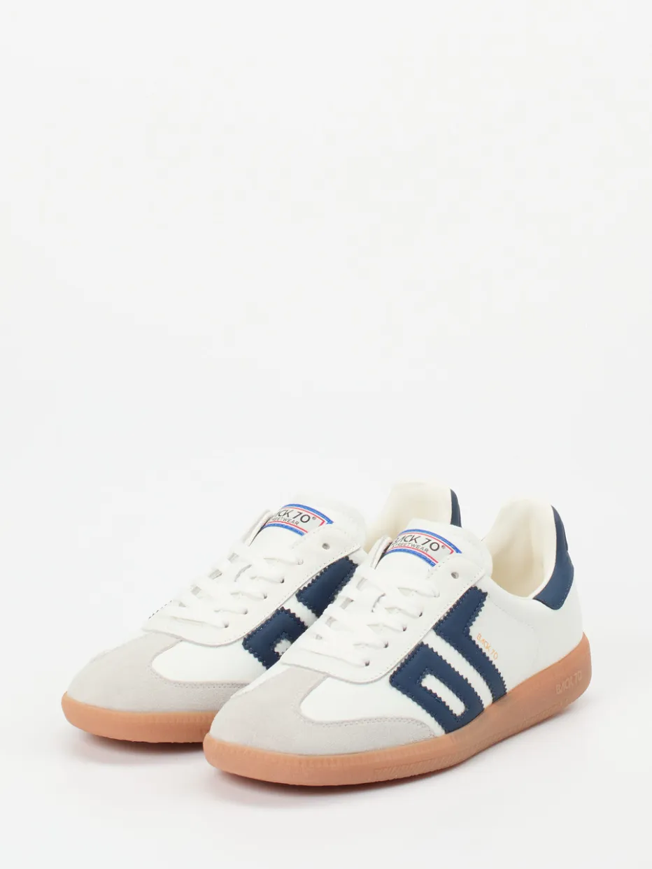 Streetstyle mit Retroflair.Back 70 interpretiert den Retro-Sneaker neu: Ein vielseitiger Unisex-Schuh mit Streetwear-Attitüde. Ob für den urbanen Alltag oder den Spaziergang durch den Park – dieser Sneaker aus geschmeidigem Lammleder mit samtig angeschliffenem Veloursleder an Kappe und Overlays bringt Stil und Komfort zusammen. Dominierendes Weiß trifft auf navyblaue Kontrastelemente und eine honigfarbene Gumsohle mit markantem Profil. Die klassische, flache Silhouette erhält durch das seitliche 70s-Label einen nostalgischen Twist. Ein atmungsaktives Textilfutter und das Wechselfußbett sorgen für optimalen Tragekomfort. Der Look passt ideal zu Jogpants, Denim oder Windbreaker. Authentischer 70s-Style mit moderner Alltagstauglichkeit von Back 70.
