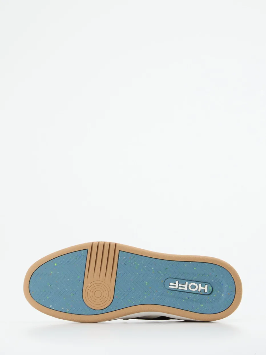 Ob beim Stadtbummel oder im Urlaub – dieser Sneaker bietet mit seinem cremeweißen, naturgenarbten Kalbleder und den schwarzen Kontrastelementen eine grafische Dynamik. Das Material-Ensemble wird ergänzt durch atmungsaktives Textilfutter aus Frottee und Mesh sowie ein herausnehmbares Schaumpolster-Fußbett. Die robuste Gummisohle mit sichtbaren Rezyklatanteilen liefert stilistische wie funktionale Stärke. Das HOFF-Branding an Ferse und Zunge sowie die klassische Lowcut-Silhouette greifen den Retro-Sneaker-Trend auf.