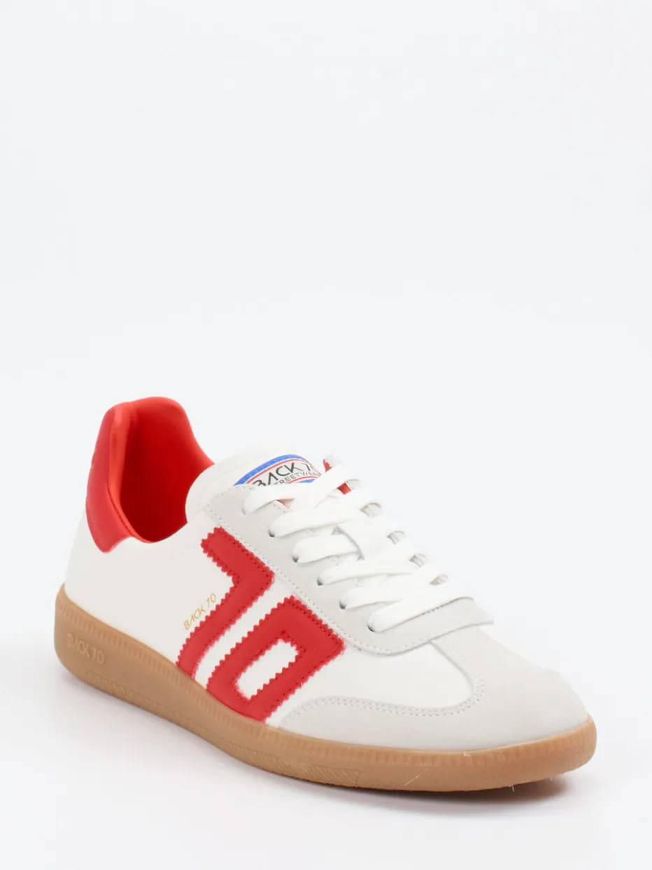 Retro-Charisma für die Straße.Back 70 präsentiert mit diesem Unisex-Retro-Sneaker ein Modell mit Streetstyle-Attitüde. Ideal für urbane Tage mit Modebewusstsein: Gefertigt aus geschmeidigem Kalbleder mit samtig angeschliffenen Velourslederdetails, kombiniert dieser Sneaker Offwhite mit akzentuierenden roten Overlays im Color-Blocking-Stil. Die flache, runde Form wird durch eine strukturierte Gummisohle ergänzt, verstärkte Ferse und das geprägte Markenlogo unterstreichen den Vintage-Charakter. Innen sorgt atmungsaktives Textilfutter für Komfort, während ein herausnehmbares Fußbett zusätzlichen Nutzen bietet. Inspiriert von Retro-Fußball-Ästhetik passt das Modell besonders zu weitem Denim oder Styles im 90er-Flair. Stilbewusstes Design im Zeichen ikonischer 70er-Grafik – typisch Back 70.