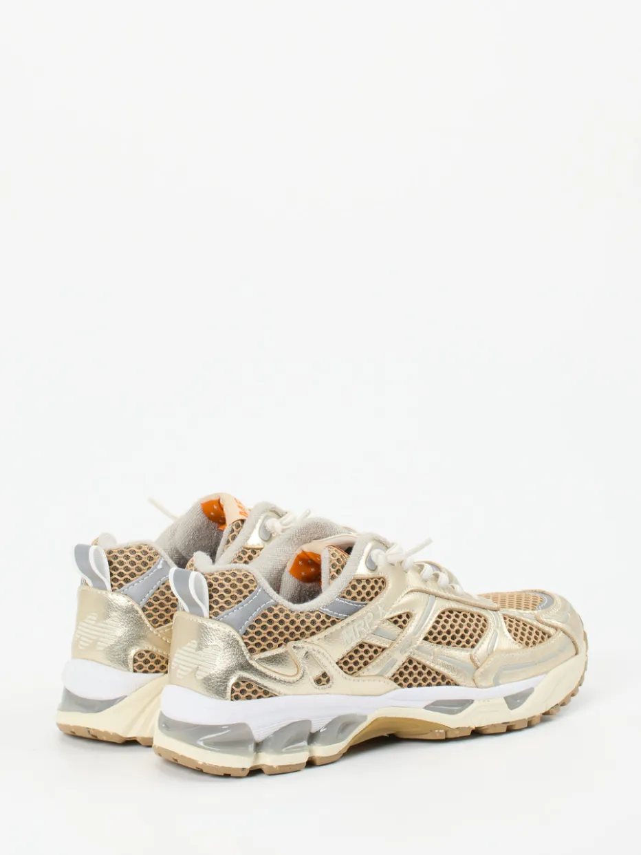Chunky Statement für urbane Styles.MRP präsentiert einen auffälligen Retro-Sneaker mit Metallic-Finish und sportlicher DNA. Für einen markanten Auftritt in der City kombiniert dieses Modell goldenes Metallic-Material mit samtiger Meshstruktur. Die dynamische Laufschuhform, reflektierende Details und Zuglasche an der Ferse betonen den Y2K-Stil. Die robuste Gummisohle mit trailähnlichem Profil sorgt für Grip im Alltag, das textile Innenfutter für Tragekomfort. Besonders trendkonform zeigt sich der Sneaker dank seiner angesagten Farbgebung und Chunky-Anmutung – ideal zu beigen Joggern oder Streetwear-Kombis. MRP steht mit diesem Design für urbanen Ausdruck und modische Eigenständigkeit.