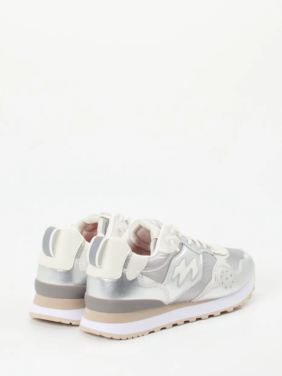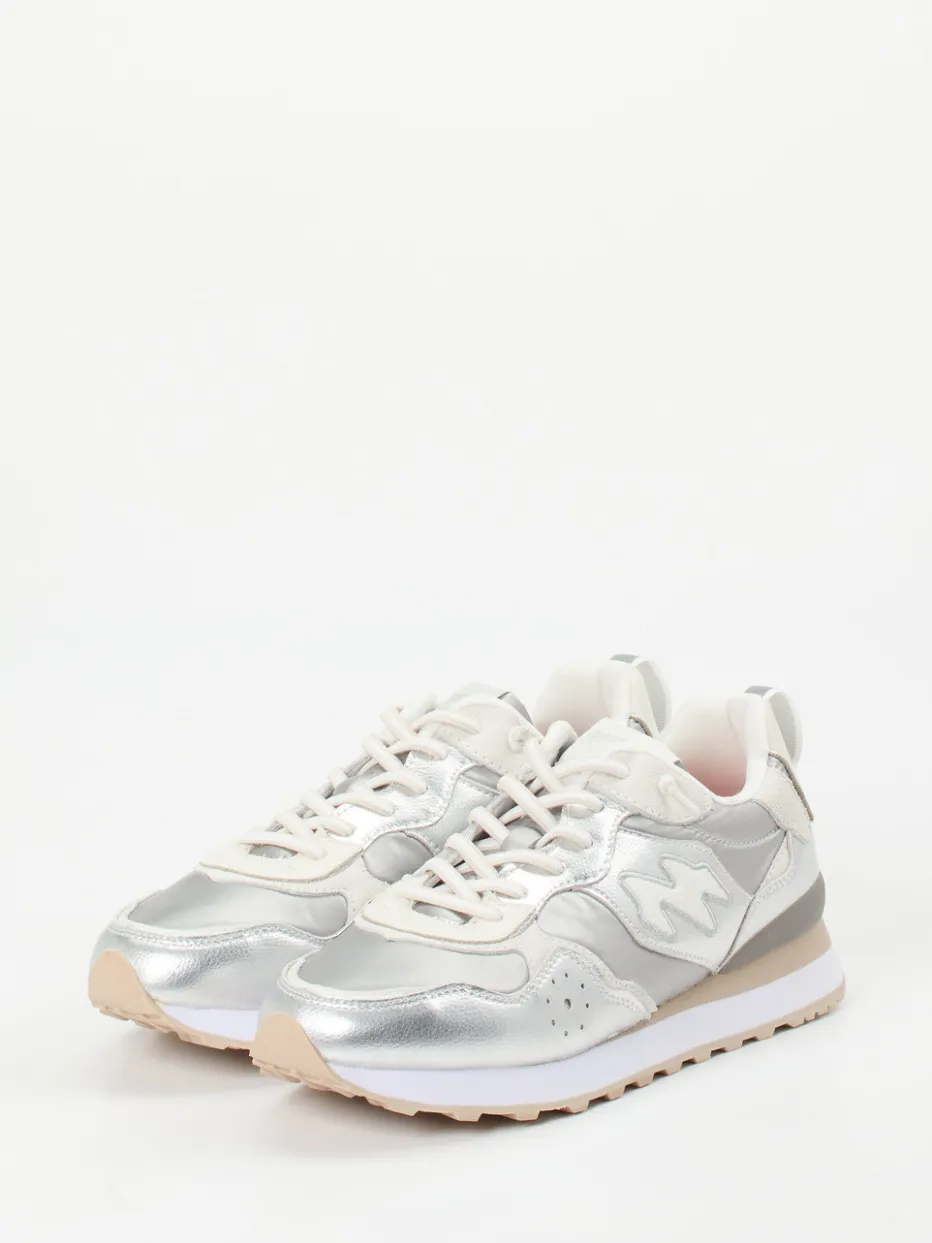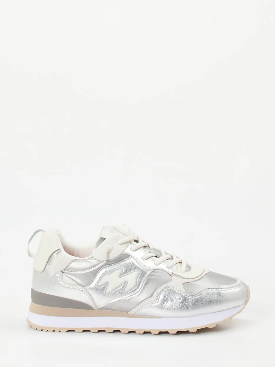 Glänzendes Statement für urbane Styles.MRP präsentiert mit diesem Sneaker für Damen einen Retro-Runner mit Flair. Ideal für Streetstyle-Momente zwischen Alltag und Ausgehen: Die Kombination aus silberfarbenem Metallic-Synthetikleder und atmungsaktivem Mesh macht den Look besonders expressiv. Dank der klassischen, niedrig geschnittenen Silhouette mit Schnürung, gepolstertem Schaft und profilierter Gummisohle bietet das Modell sichtbaren Vintage-Charme und hohen Komfort. Die Ton-in-Ton-Nähte unterstreichen die klare Linienführung, während Metallic-Akzente zu aktuellen AW24-Trends passen. Harmoniert gut mit Nylon-Joggern oder einer silbernen Crossbody Bag. Stylebewusste Optik mit extravaganter Streetwear-Note von MRP.