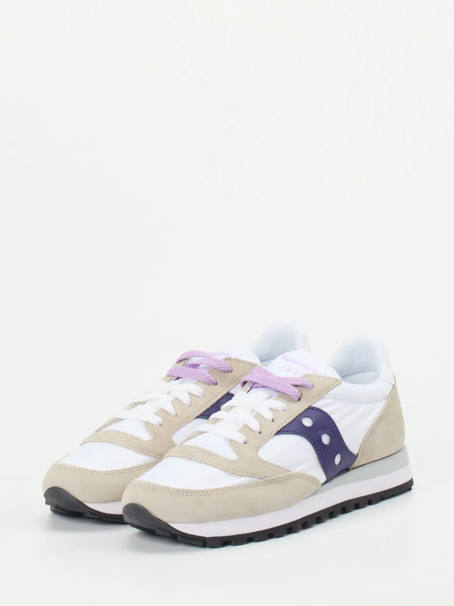 Frühjahrstrend mit 90s-Flair.Saucony zeigt mit diesem Unisex-Sneaker der Kategorie Retro-Runner ein angesagtes Modell im Stil der 90er. Für entspannte City-Walks oder aktive Freizeitoptionen bietet der Materialmix aus weißem Nylon und tonigem Veloursleder, samtig angeschliffen, eine ausgewogene Kombination aus Leichtigkeit und Struktur. Dunkellila Akzente an Schnürsenkeln und Logos setzen farbstarke Kontraste. Die flache Silhouette mit gepolstertem Schaftrand und die rutschhemmende Gummisohle mit Dreiecksprofil sorgen für Alltagskomfort. Dank Streetwear-kompatiblem Look mit Trendbezug zu Pastell-Farben ist das Modell ein echtes Fashion-Statement. Typisch Saucony: authentisches Design vereint mit funktionalem Komfort.