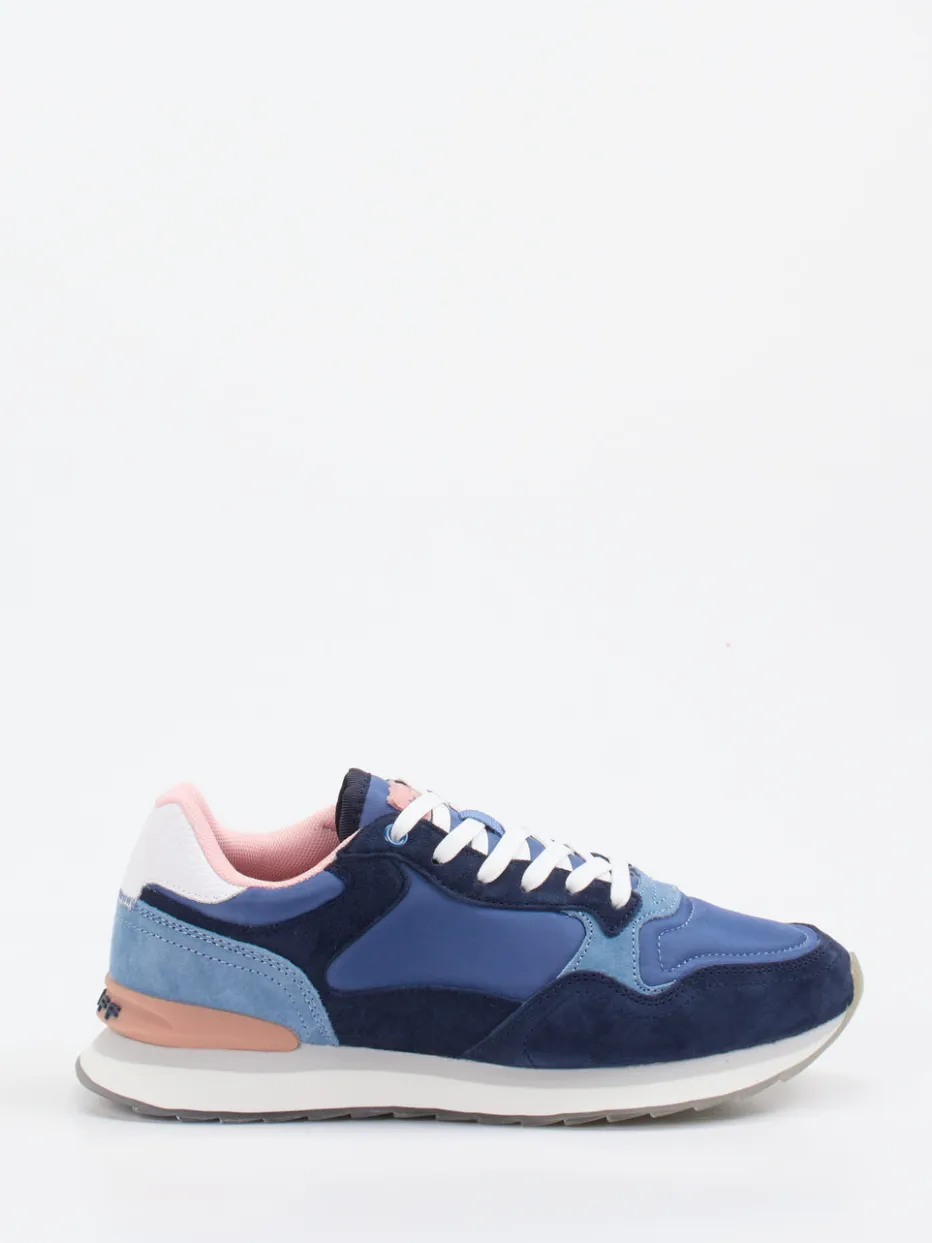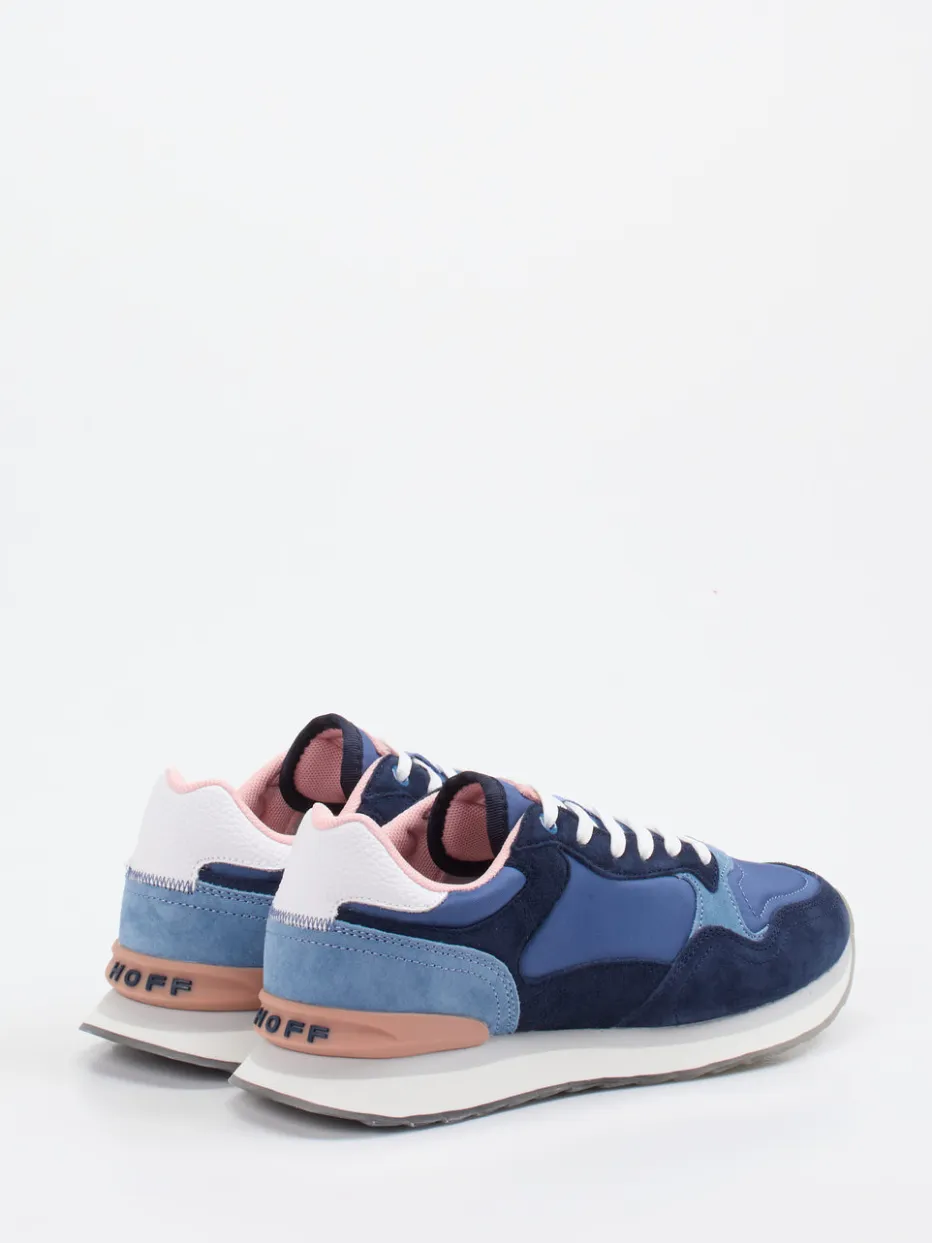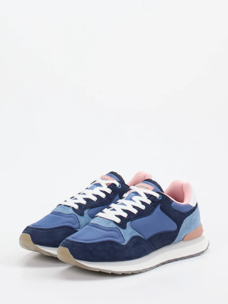 Pastell trifft Streetstyle.THE HOFF BRAND präsentiert mit diesem Retro-Sneaker ein ausdrucksstarkes Modell aus der Städte-Edition. Für entspannte Freizeitmomente mit Blickfang-Garantie sorgt das Design aus strukturiertem Veloursleder, Nylon und Mesh in Dunkelblau, Jeansblau und Altrosa. Die sportlich-dynamische Low-cut-Silhouette wird durch die schneeweiße Schnürung, ein gepolstertes Schaftrand-Finish und die transluzente Gummisohle mit Printdetails ergänzt. Trendstarke Akzente wie das weiße Fersenpanel und das Markenlogo auf der Sohle interpretieren den Retro-Look modern. Stylingtipp: bestens kombinierbar mit pastellfarbenen Socken oder leichten Streetwear-Bags. Markanter Komfort trifft auf kreatives Farbspiel in ikonischem HOFF-Design.