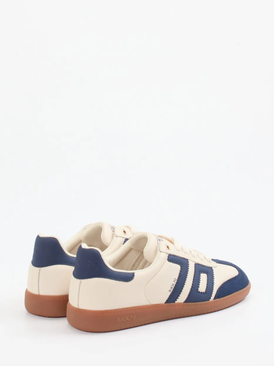 Retro-Vibes im Streetstyle-Format.Die Marke Back 70 bringt mit diesem Retro-Sneaker den Style der 70er in urbane Looks. Für entspannte Alltagsmomente oder trendbewusste Freizeitoutfits überzeugt der flach-runde Unisex-Sneaker mit einem Mix aus geschmeidigem Kalbleder und samtig angeschliffenen Veloursleder-Besätzen. Die dominant cremeweiße Farbgebung wird von dunkelblauen Kontrastelementen und goldfarbenen Ösendetails spannungsvoll akzentuiert. Eine honigfarbene Gummisohle mit markanter Profilstruktur sorgt für Standfestigkeit, während das atmungsaktive Innenfutter und das Wechselfußbett den Komfort erhöhen. Farbblocking und Vintage-Silhouette geben dem Design modische Tiefe. Ein charakterstarker Begleiter mit markentypischem 70s-Flair und urbaner Lässigkeit.