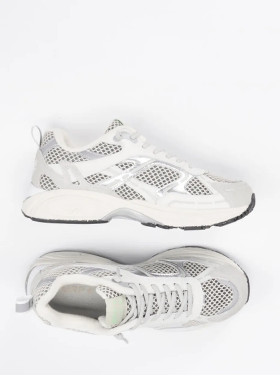 Retro-Tech für moderne Streetlooks.MRP bringt mit diesem Retro-Sneaker ein Modell für Damen auf den Markt, das sportlichen Lifestyle mit Trendsicherheit vereint. Ideal für den urbanen Alltag überzeugt das Modell durch seinen Materialmix aus Velour und atmungsaktivem Mesh in matt-texturierter Oberfläche. Silbermetallic-Overlays und reflektierende Details setzen modische Akzente auf dem Offwhite-Grundton. Die dynamisch geformte Silhouette, die markentypisch gepolsterte Zunge mit Branding sowie die Gummisohle mit 3,5 cm Absatzhöhe sorgen für Komfort und Style. Von Streetwear bis Casual athletisch kombinierbar. Ein modernes Statement für trendorientierte Sneaker-Fans mit Sinn für Funktionalität.