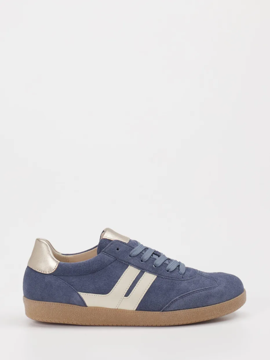 Ideal für entspannte Citytage: Das Modell verbindet eine klassische flache Silhouette mit hochwertigem Velourleder in Jeansblau und auffälligen Metallic-Akzenten an Zunge und Ferse. Kontrastierende cremeweiße Seitenstreifen und eine profilierte Gummisohle mit Fischgrätenmuster sorgen für visuelle Spannung und Tragekomfort. Dank Schnürung und verstärkter Fersenkappe sitzt der Schuh sicher, während sein 90s-Design perfekt in trendorientierte Casual-Looks passt. Besonders stylisch zur Jeansjacke im Used-Look oder Metallic-Bag.