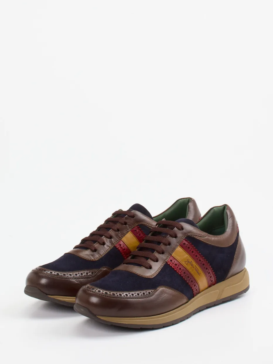 Smart-Casual trifft Vintage-Charme.Der Retro-Sneaker von Galizio Torresi für Herren verbindet klassische Linien mit moderner Eleganz. Perfekt für entspannte Office-Days oder stilvolle Freizeit-Outfits: Der Sneaker kombiniert samtig angeschliffenes Veloursleder in Dunkelblau mit fein verarbeitetem Kalbleder in Braun. Kontraststreifen in Rotbraun und Goldgelb setzen Akzente, Broguing-Details und eine verstärkte Ferse runden das Design ab. Die Gummisohle sorgt für zuverlässigen Halt, während das austauschbare, gepolsterte Fußbett Tragekomfort auf höchstem Niveau bietet. Retro Runner trifft italienisches Understatement für den aktuellen Color-Blocking-Trend. Mit Galizio Torresi zeigt sich Casual-Luxus formvollendet – in Verarbeitung, Komfort und Stil.