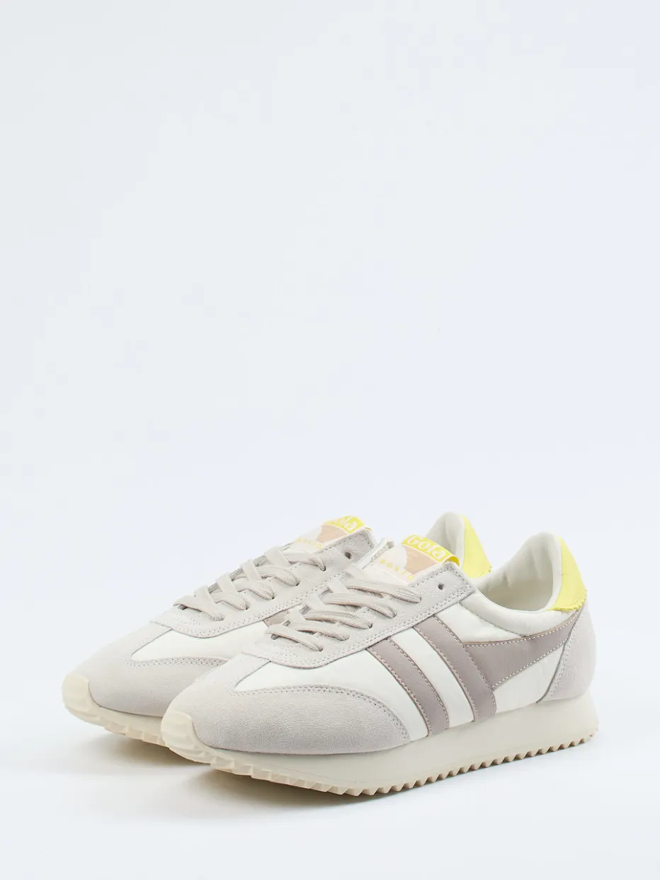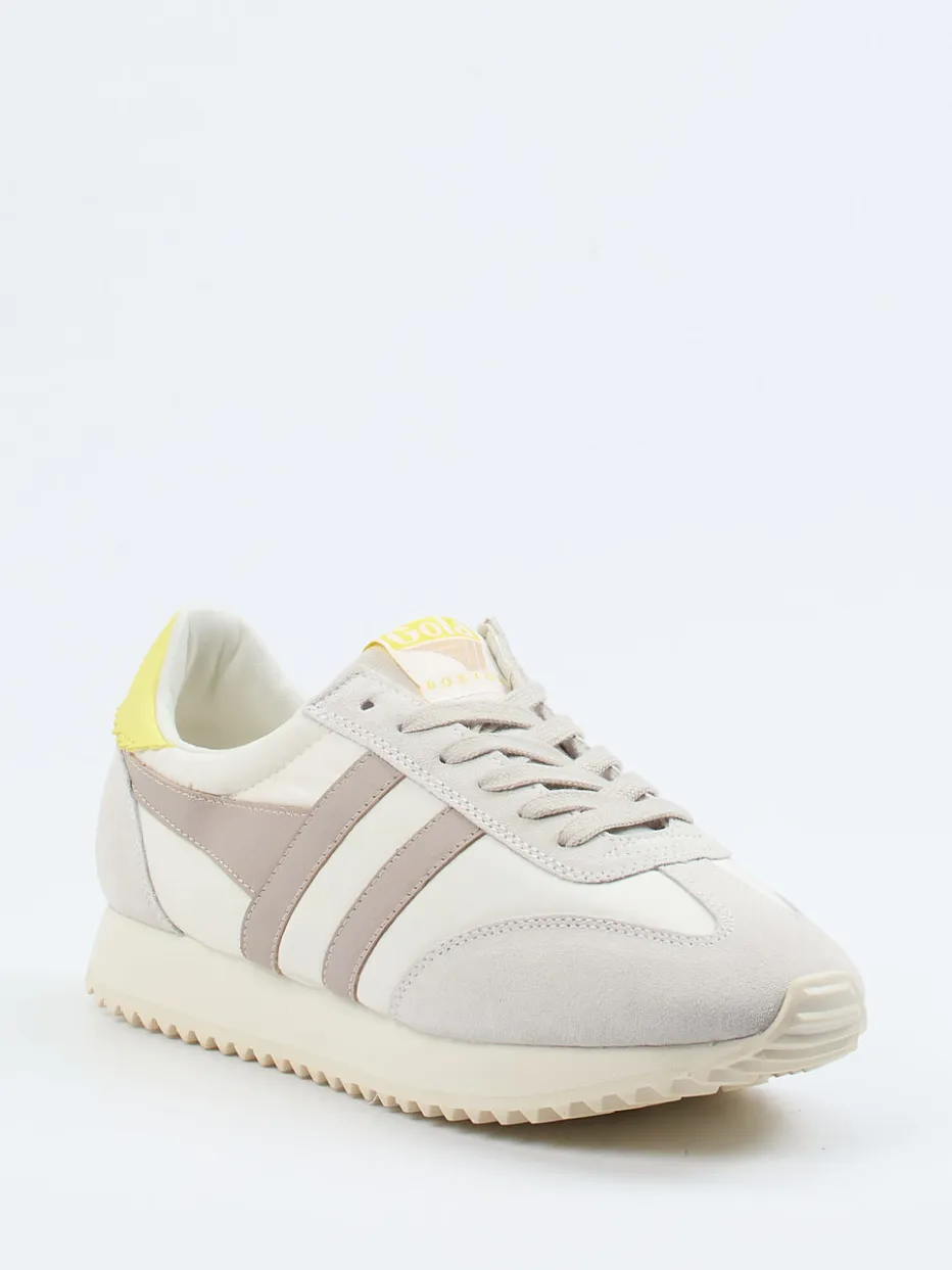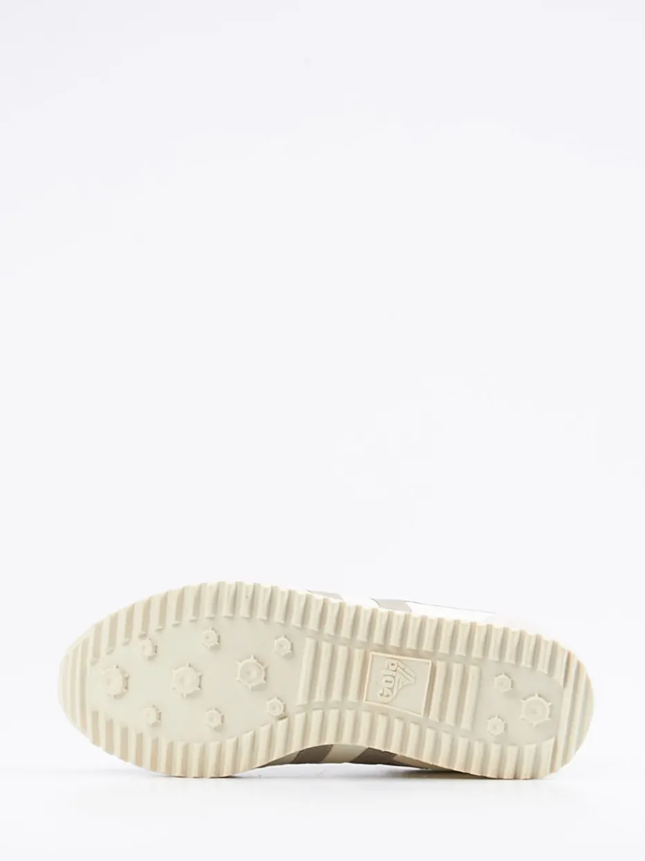 Retro-Vibes in Pastelltönen.Der Boston 78 von Gola ist ein Retro-Sneaker aus Veloursleder, inspiriert vom Running-Stil der 70er-Jahre. Ideal für entspannte Alltagsmomente überzeugt das Modell mit samtig angeschliffenem Veloursleder und Fallschirmseide, ergänzt durch eine cremeweiße Oberfläche und Details in Taupe und Pastellgelb. Die flache, schmale Silhouette und tonale Nähte unterstreichen den Vintage-Charakter. Eine profilierte Gummisohle sowie atmungsaktives Textilfutter und eine herausnehmbare Innensohle sorgen für hohen Tragekomfort. Trendgerecht mit Athleisure-Elementen kombiniert. Gola bietet hier Komfort mit ikonischem Retro-Flair – ideal für lässige Styles mit Aussage.