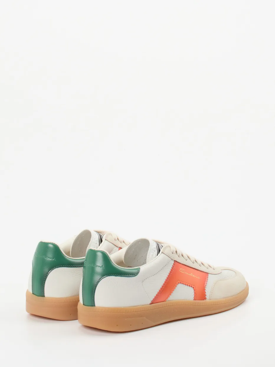 Hommage an die 90er mit stilistischem Feinschliff.Der Retro-Sneaker von Santoni interpretiert die sportiven Linien der 90er neu. Gefertigt aus feinem Veloursleder mit Anteilen aus mattiertem Glattleder in Cremeweiß verbindet er Ästhetik und Komfort. Kräftige Farbakzente in Signalorange und Tannengrün kontrastieren harmonisch mit dem hellen Obermaterial. Die flach-zulaufende Silhouette, seitliche Logo-Prägung sowie eine honigfarbene Schalensohle aus Gummi betonen das markante Design. Inspiriert von Vintage Streetwear ist dieses Modell ideal für trendorientierte Casual-Outfits. Hochwertige italienische Manufakturkunst trifft auf zeitgemäßes Sneaker-Design.