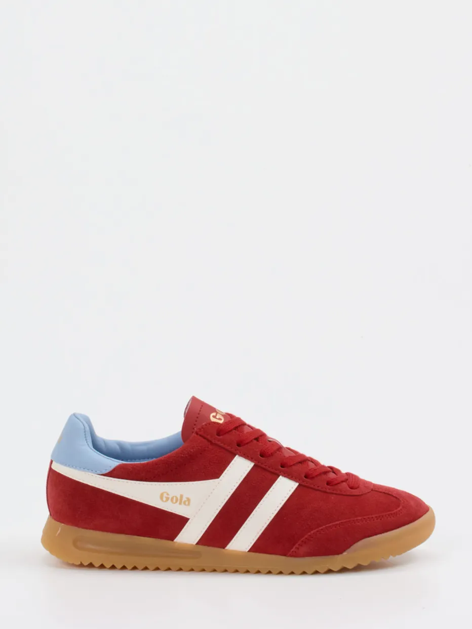 Vintage-Vibes im modernen Streetstyle.Gola präsentiert mit diesem Retro-Sneaker ein Modell für urbane Freizeitlooks. Der dunkelrote Schuh aus hochwertigem Veloursleder mit samtig-matter Oberfläche überzeugt durch seine flache, schmale Silhouette. Weiß abgesetzte Streifen und ein hellblaues Fersenelement setzen auffällige Kontraste im Color-Blocking-Stil. Typisch für den sportiven Charakter ist die profilierte Gummisohle mit Retro-Noppenstruktur sowie der gepolsterte Einstieg mit Textilfutter. Goldene Logodetails runden das Design ab. Ideal kombinierbar mit Jeans, Jogpants oder Cropped-Pants. Gola steht für charakterstarken Retro-Charme mit sportlichem Stilprofil.