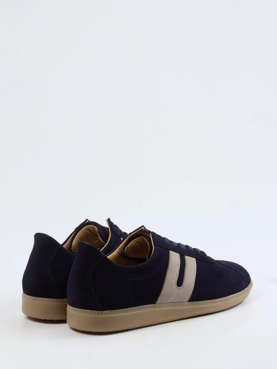 Ideal für entspannte City-Tage oder den Weg ins Atelier: Gefertigt aus dunkelblauem Veloursleder mit samtigem Finish überzeugt der Schuh mit schlankem Schnitt und beigegrauen Zierstreifen. Die naturfarbene Gummisohle sorgt für Bodenhaftung und rundet den Retro-Look funktional ab. Innen komfortabel mit Kalblederfutter und gepolstertem Fußbett ausgestattet, passt der Sneaker perfekt zu Chinos oder Casual-Wear im „Quiet Luxury“-Stil.