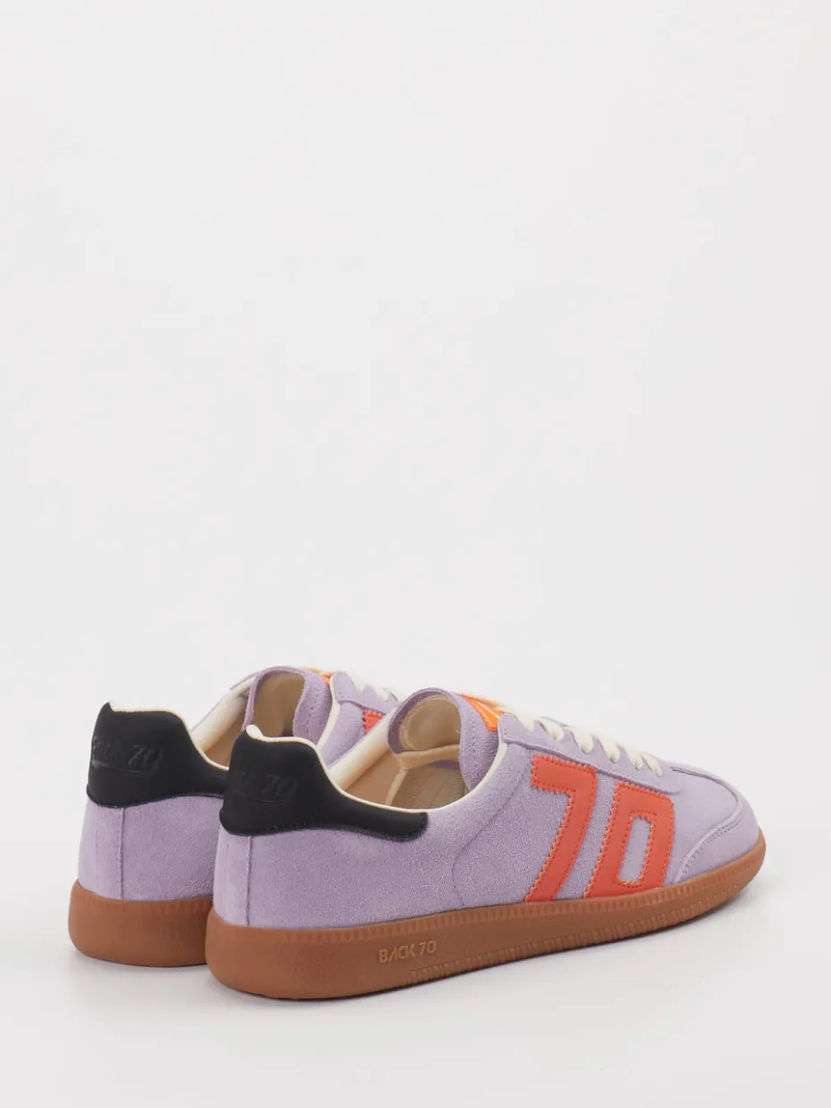 Zeitgeist pur: Der Retro-Sneaker von Back 70 kombiniert fliederfarbenes Veloursleder mit markantem Colorblocking in Koralle und Schwarz – eine stilbewusste Hommage an die 90er.