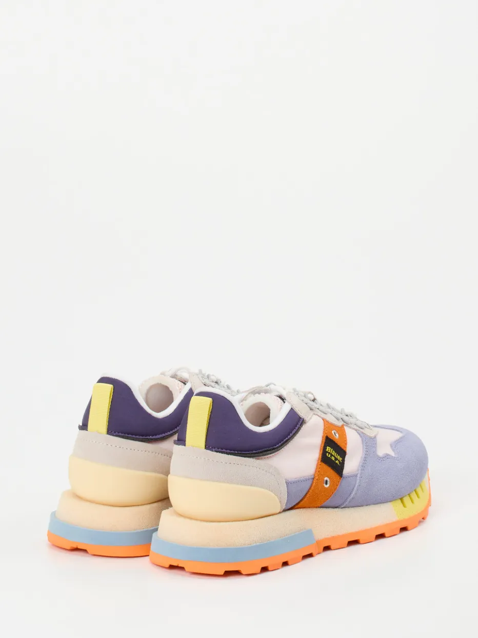 Dieser Retro-Sneaker von Blauer kombiniert Veloursleder mit atmungsaktiven Textilien zu einem kraftvollen Colorblocking-Design in Pastell und Neon. Ideal für stilbewusste Alltagslooks mit Streetwear-Attitüde.