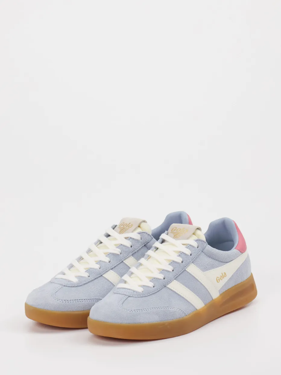 Der Retro-Sneaker von Gola bringt frische Leichtigkeit in die Sneaker-Kollektion. Ideal für entspannte Alltagsmomente verbindet das Modell softes Veloursleder mit einer angenehm texturierten Oberfläche. Die Farbgebung in Hellblau mit altrosa Akzenten und cremeweißen Kontraststreifen unterstreicht das Vintage-Flair. Ein goldfarbener Logoprint sowie die klassische flache Silhouette mit Schnürverschluss runden das Design stilvoll ab. Die Gummisohle mit rutschhemmendem Profil sorgt für Komfort bei urbanen Aktivitäten. Im Streetwear inspirierten Stil passt der Schuh perfekt zu lässigen Denim-Looks oder pastellfarbenen Socken. Ein modischer Alltagsbegleiter mit authentischem 90er-Spirit aus dem Hause Gola.