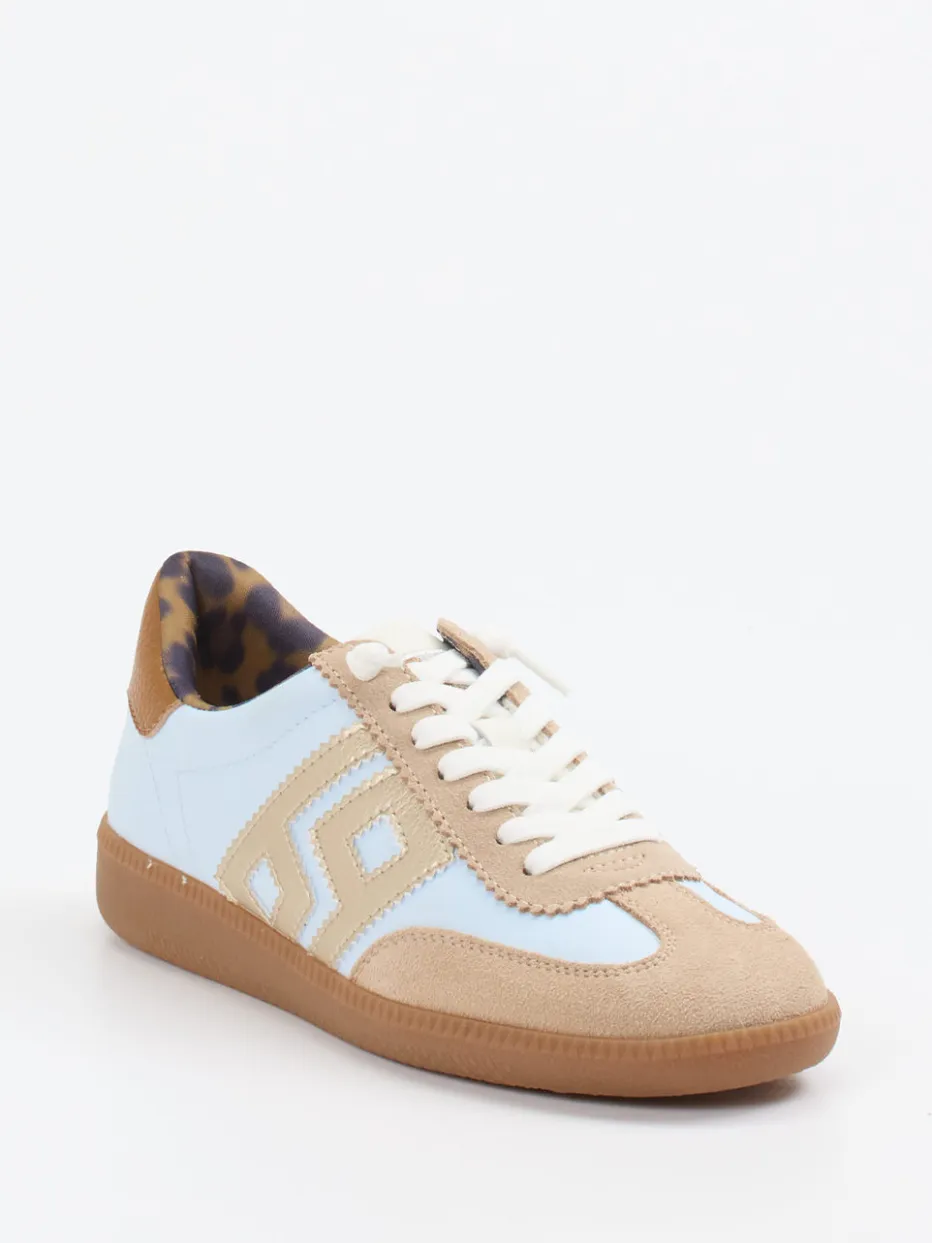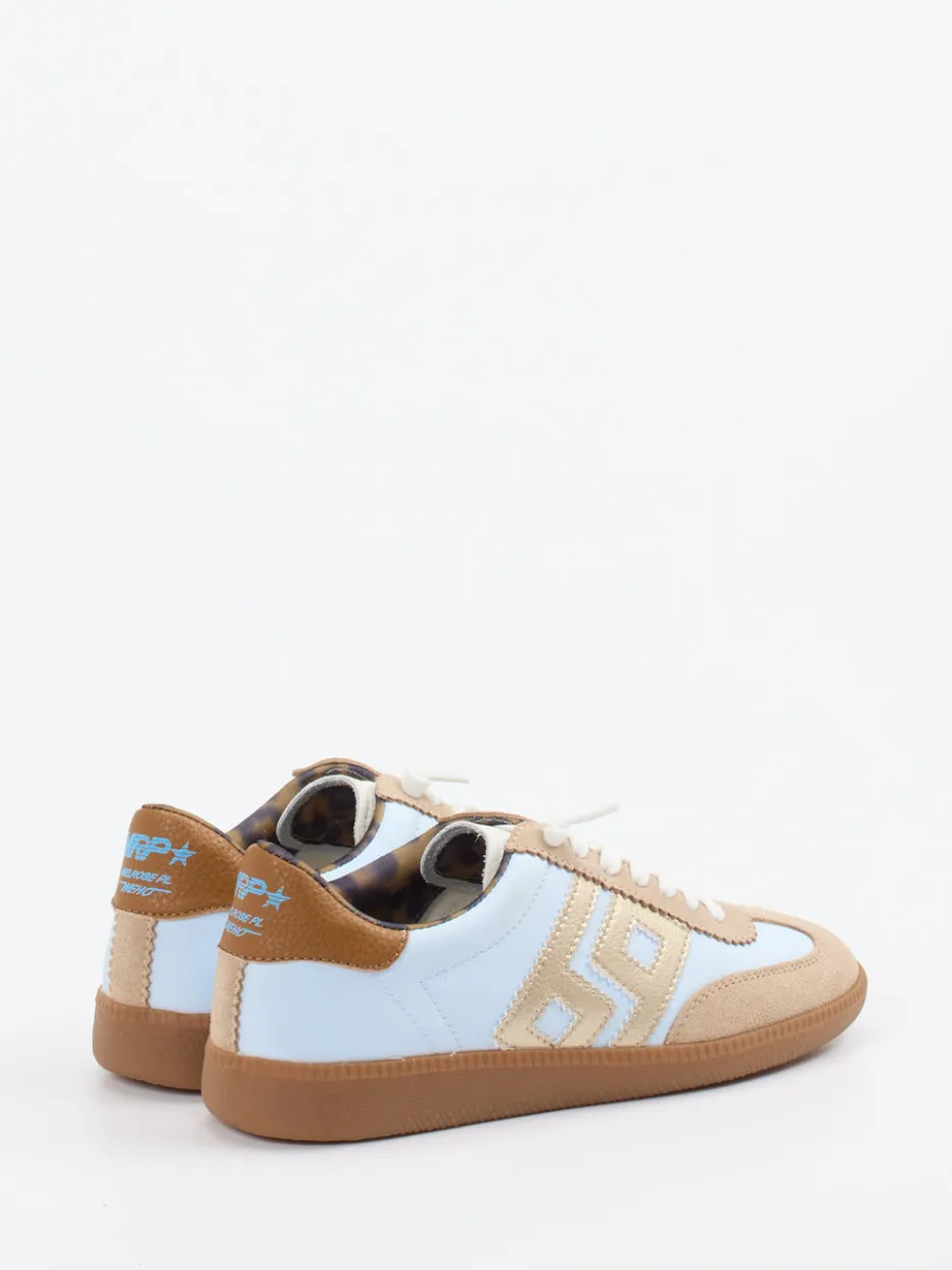 Unisex-Stil mit Retro-Statement.MRP präsentiert mit diesem Sneaker ein modisches Highlight der Kategorie Retro-Sneaker. Die Kombination aus beigem Veloursleder und hellem Textil wird durch hellblaue Akzente charakterstark ergänzt. Sein flacher Schnitt sowie ein Schnürverschluss betonen die 90s-inspirierte Silhouette, während Leoprint-Futter und eine goldfarbene Logo-Applikation unverkennbare Blickfänge setzen. Die profilierte Gummisohle sorgt für sicheren Halt, auch beim Stadtbummel oder auf Reisen. Dank wechselbarem Fußbett eignet sich der Schuh hervorragend für individuelle Einlagen. Ein Must-have für trendorientierte Casual-Looks. MRP steht hier für stilvolle Alltagstauglichkeit mit ikonischem Designanspruch.
