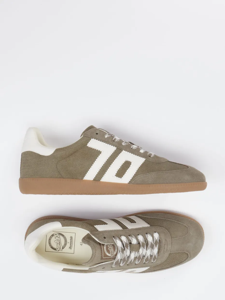 Olivgrüner Klassiker im Retro-Update. Back 70 reinterpretieren den Sneaker-Klassiker mit einem Retro-Sneaker für Alltag und Freizeit. Dieser flach geschnittene Unisex-Schuh kombiniert weiches Veloursleder mit textilem Material und zeigt sich in einem olivgrünen Ton, akzentuiert durch cremeweiße und braune Details. Die kontrastfarbenen Schnürsenkel mit Zickzack-Muster sowie geprägte Logos auf Zunge und Ferse ergänzen das stilvolle Design. Mit profilierter Gummisohle, Schnürverschluss und verstärkter Ferse bietet das Modell komfortablen Halt – perfekt für Streetwear-Looks mit Vintage-Einschlag. Ein idealer Partner zu Canvas-Rucksack und Retro-Shirt. Raffiniertes Design mit nostalgischem Flair – Back 70 setzt auf markanten Stil und Alltagstauglichkeit.