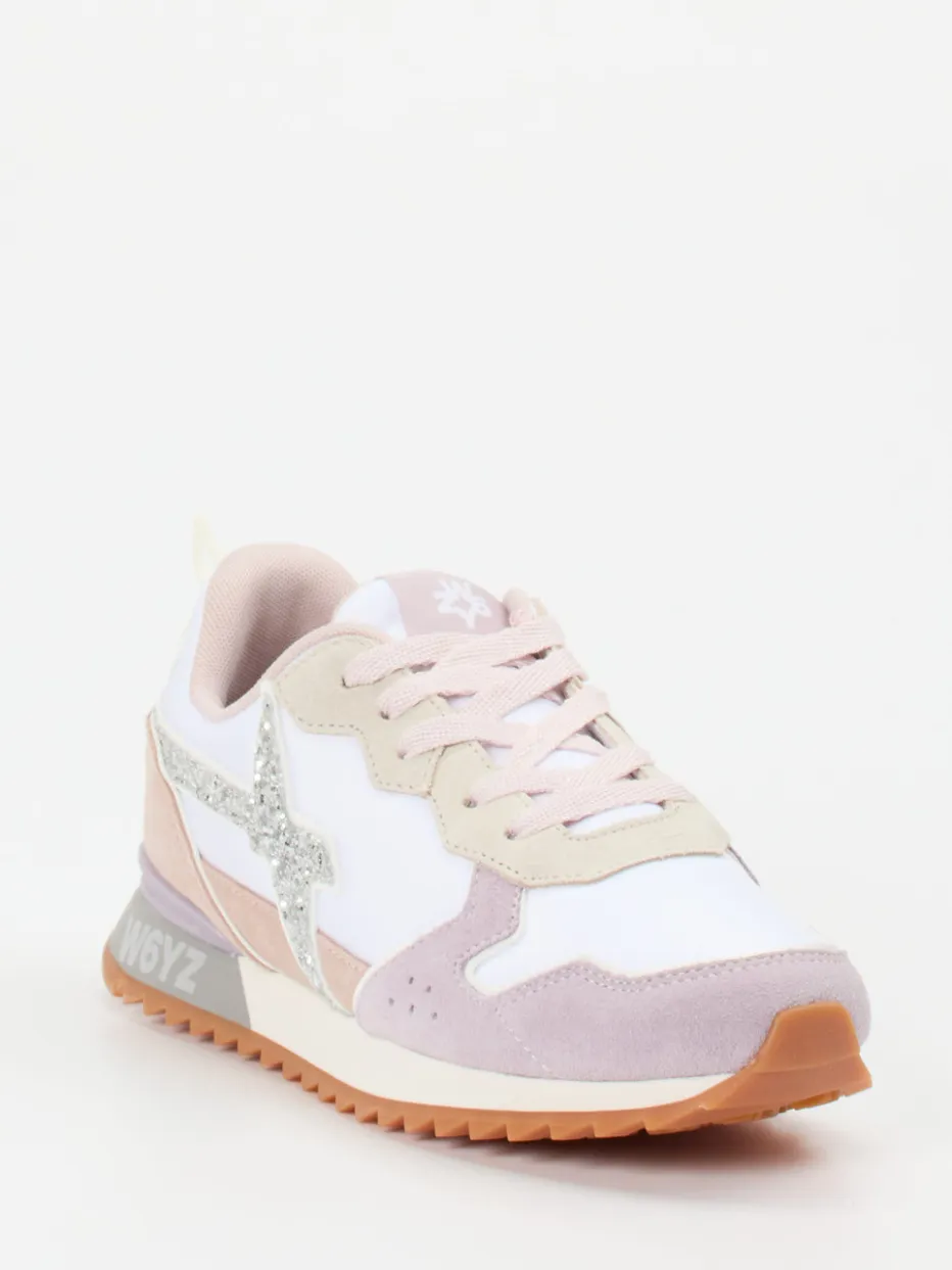 Frühjahrstrend mit Retro-Charme.W6YZ präsentiert einen femininen Retro-Sneaker, der Streetwear mit Glamour verbindet. Ideal für Alltag oder Ausgehen: Der Sneaker vereint roséfarbenes Veloursleder mit samtiger Textur, weißes Meshmaterial und silberglitzernde Applikationen. Die low-cut Silhouette erinnert an klassische Runner-Modelle, während die honigfarbene Gummisohle mit Sternprofil für Trittsicherheit sorgt. Logo-Prints an Zunge und Ferse unterstreichen die Markenidentität. Der Pastellton und Blitz-Glitzerdetails greifen aktuelle SS24-Trends auf. Kombinierbar mit Nude-Tönen oder sportiven Pieces. Ein stylischer Sneaker für ausdrucksstarke Mode-Momente im Frühling.