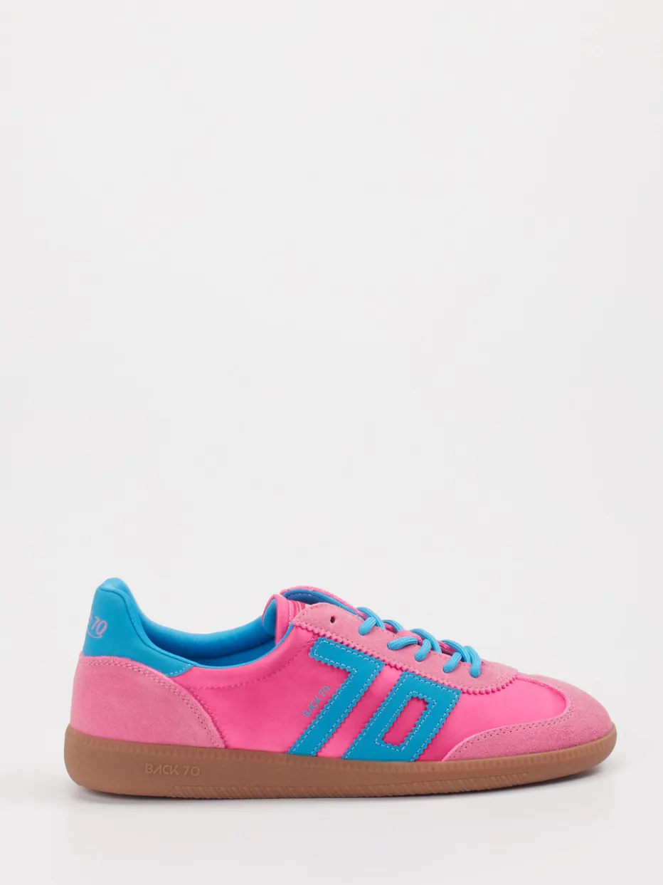 Für starke Looks mit Nostalgie-Faktor. Back 70 präsentiert einen Retro-Sneaker, der modernen Y2K-Stil mit Vintage-Einflüssen kombiniert. Ideal für urbane Freizeitmomente und ausgehfreudige Styles zeigt sich dieser flache Sneaker mit markanter Gumsohle, Veloursleder/Textil-Mix und matten Flächen in kräftigem Pink, Türkisblau und Hellbraun. Schnürverschluss und profilierte Sohle unterstreichen den sportiven Charakter, kontrastierende Ziernähte und Logos sorgen für visuelle Highlights. Eine Hommage an die 90er trifft auf aktuellen Color-Blocking-Trend. Ein Sneaker, der Ausdruck verleiht und lässige Outfits stilvoll abrundet.