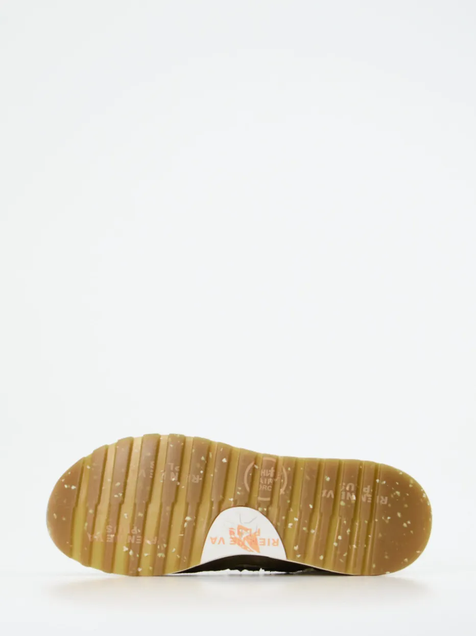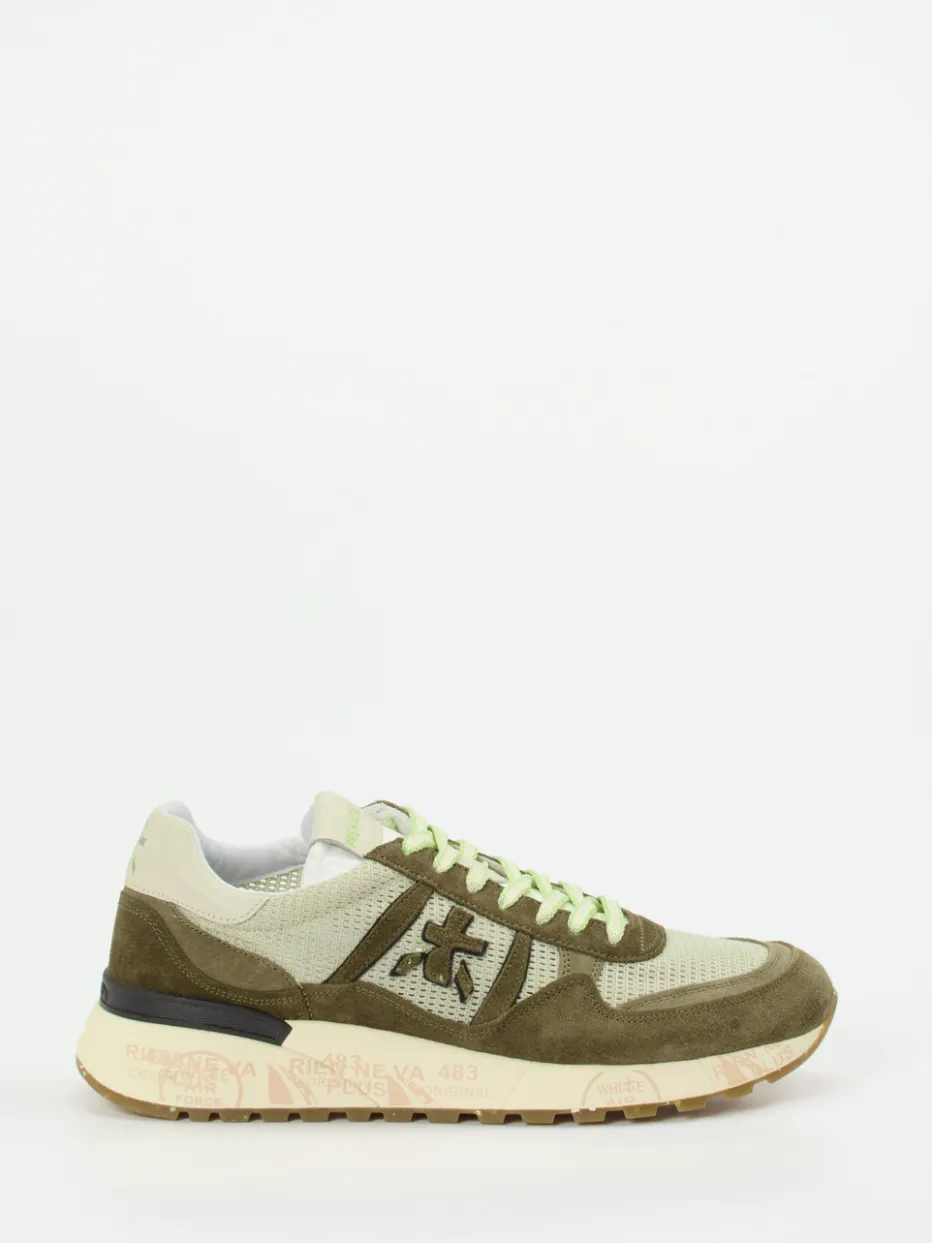 Streetwear mit Retro-Fokus.Die Marke Premiata interpretiert klassische Running-Sneaker neu. Das Modell Landeck überzeugt mit mutiger Farbkombination und innovativem Materialeinsatz. Für wärmere Tage ideal: atmungsaktives Meshtextil in Beigegrau, kombiniert mit samtigem Veloursleder in Olivtönen. Neongrüne Schnürsenkel, eine markant bedruckte, recycelte Gummisohle und das typische Branding setzen betonte Akzente im Streetstyle. Dank flacher Silhouette, wechselbarem Fußbett und Leder-/Textilfutter ist hoher Komfort geboten. Der Unisex-Look passt perfekt zum aktuellen Y2K-Trend. Ein Sneaker mit Charakter – präzise gearbeitet und stilistisch vielseitig.