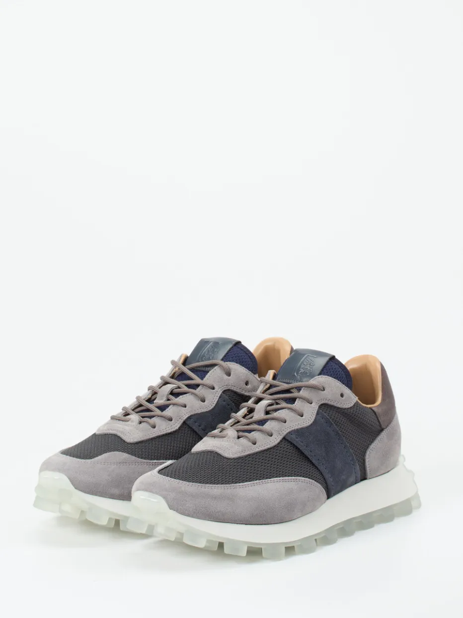 Ideal für entspannte City-Walks oder den Weg ins Café: Hellgraues Veloursleder kombiniert sich mit anthrazitfarbenem und navyblauem Mesh zu nuancenreicher Monochromatik. Weich aufgeraute, glatte und meshartige Partien variieren den Look. Der gepolsterte Schaftrand und ein herausnehmbares Fußbett versprechen Tragekomfort. Die grob profilierte, transluzente Gummisohle verleiht dem Design Outdoor-Attitüde bei urbaner Alltagstauglichkeit. Ein Sneaker im Trendbild des aktuellen Gorpcore-Stils – perfekt zum Layering mit Jogpants oder Nylonjacke.