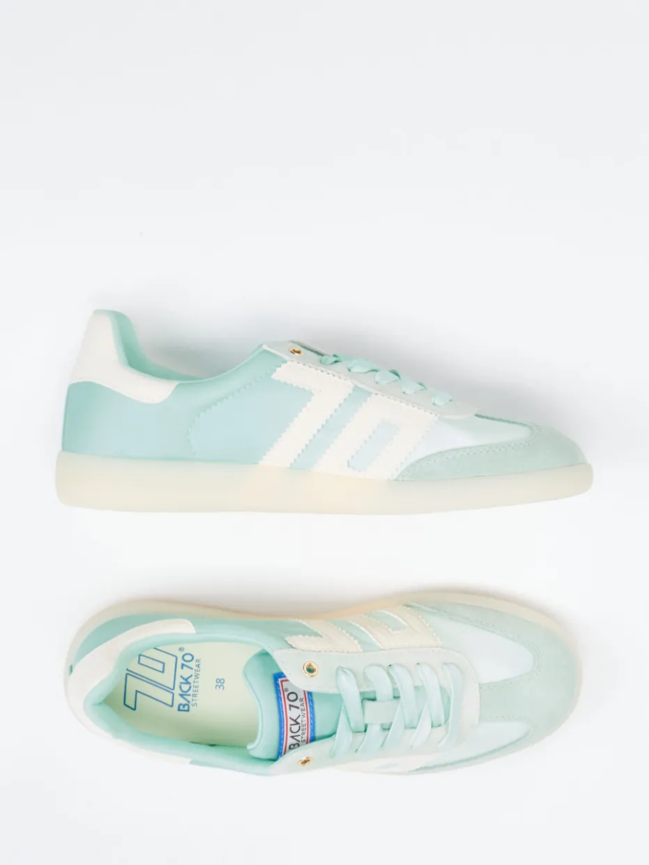 Frische Pastellpower für urbane Styles.Back 70 präsentiert mit diesem Retro-Sneaker eine stilvolle Kombination aus Streetwear und Saisontrend. Ideal für warme Tage in der Stadt bietet der Unisex-Sneaker dank atmungsaktivem Nylon in Mintgrün und samtigem Veloursleder leichten Tragekomfort. Die flach-schmale Silhouette wird von goldfarbener Öse und strukturiertem Fersenbesatz akzentuiert. Die milchige Gummisohle mit markantem Profil ergänzt den trendigen Vintage-Charakter. Ausgestattet mit gepolstertem Schaft und Memory-Foam-Fußbett eignet sich das Modell perfekt für Freizeit und Urlaub. Besonders wirkungsvoll zu pastellfarbenen Accessoires. Verbindet Stilgespür mit lässigem Komfort im Look der 90er.