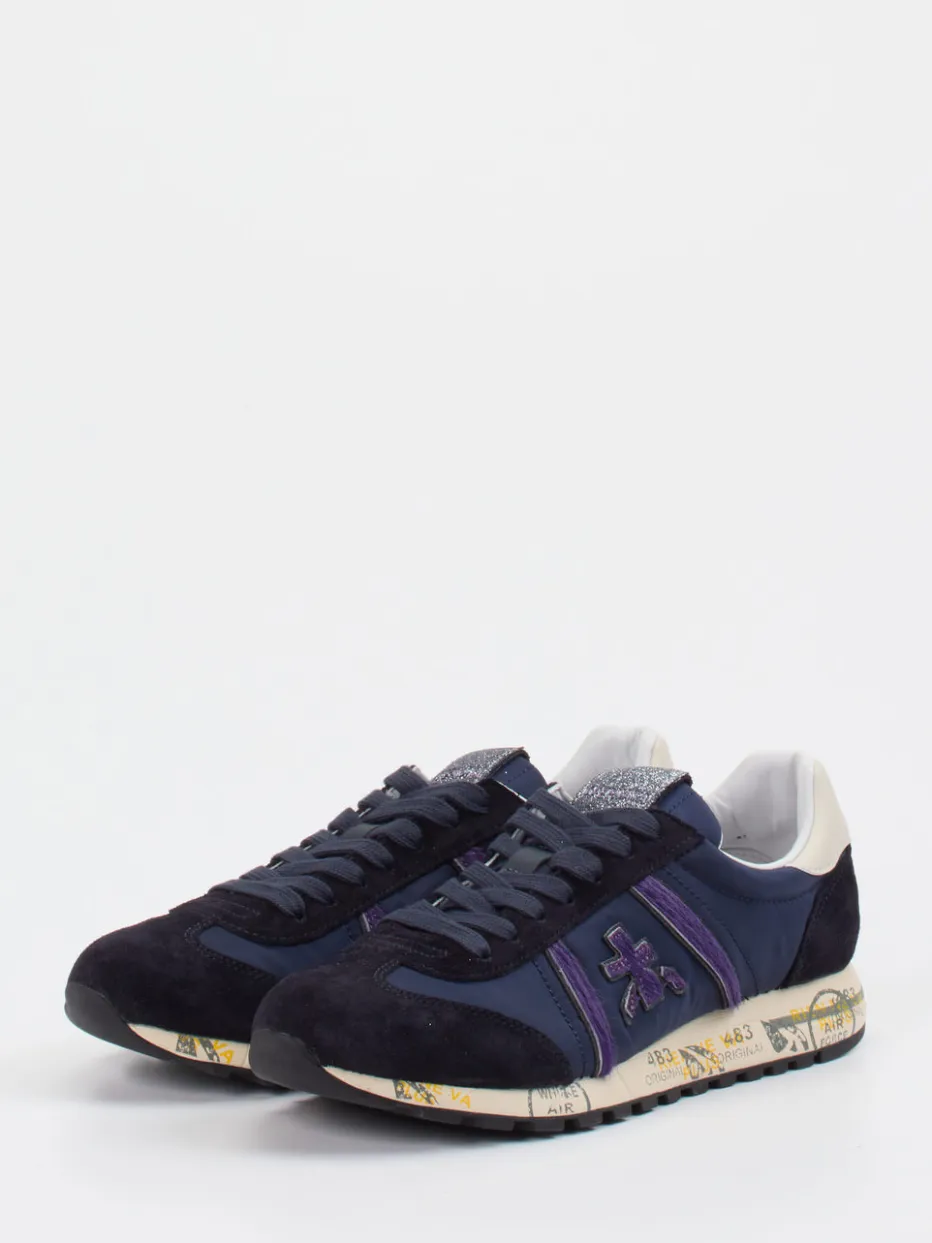Glitzer trifft Retro-Flair.Premiata bringt mit diesem Retro-Sneaker aus Veloursleder und Nylon einen markanten Style für Freizeit und urbanes Streetwear-Umfeld. Die samtig-glatte Oberfläche in dunklem Blau wird durch violette und offwhite Akzente kontrastiert. Besondere Highlights wie die glitzernde Zunge und die bedruckte Zwischensohle mit Retro-Grafik prägen das Erscheinungsbild. Die mehrteilige Laufsohle und der gepolsterte Einstieg sorgen für Komfort und Stabilität bei alltäglicher Bewegung. Das Modell orientiert sich am Y2K-Trend und passt als Eyecatcher zu expressiven Looks. Ein Design, das Markencharakter und Trendgespür stilvoll vereint.
